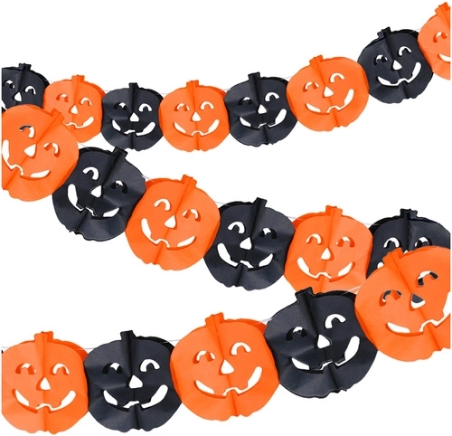 Papír girland nagy, intenzív narancssárga tökökkel, amely minden bulinak megadja a megfelelő halloweeni hangulatot. Hossza 3 m, egy tök mérete 17,5 × 17,5 cm – feltűnő dekoráció Halloweenre, őszi ünnepekre, otthonba, óvodába, üzletbe vagy a kertbe. Könnyű kialakítás és egyszerű felakasztás a gyors díszítésért „WOW” hatással.