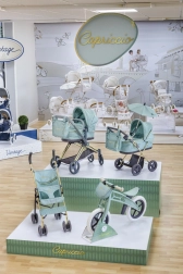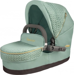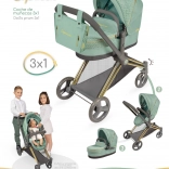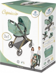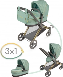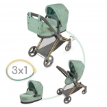 Elegáns, 3 az 1-ben babakocsi babáknak a CAPRICCIO kollekcióból modern mentazöld színben: mély mózeskosár, sportülés és hordozható betét. Állítható kupola, forgó első kerekek a könnyű manőverezéshez, tárolókosár és levehető táska arany cipzárokkal. Összecsukható váza helytakarékos, 3 éves kortól ajánlott.