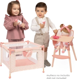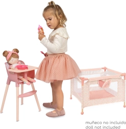 A stílusos DeCuevas Tulipe 2 az 1-ben babaszett egyesíti a játékkarámot és az etetőszéket lágy pasztellszínekben, tulipán mintával. Precíz kidolgozást, könnyű kezelhetőséget kínál, és ideális legfeljebb 36 cm-es babákhoz. Remek kiegészítő egy kislányszobába, gyönyörű spanyol dizájnnal.