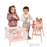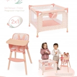 A szett tartalmaz egy masszív játékkarámot hálós oldalfalakkal és praktikus zsebbel az apróságoknak, valamint egy etetőszéket levehető tálcával és hárompontos övvel a baba biztonságos rögzítéséhez. Mindkét terméket legfeljebb 36 cm-es babákhoz tervezték, és könnyű kezelhetőségükkel és karbantartásukkal tűnnek ki.