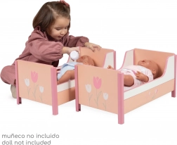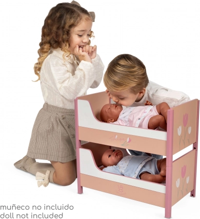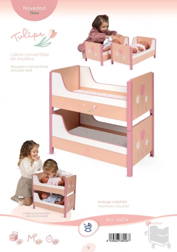 Ajándékozzon a gyerekeknek szép díszletet kedvenc babáikhoz. A Tulipe kollekció 2 az 1-ben fa ágya meleg lazac tónusokkal és stílusos virágmintával kínál emeletes fekhelyet vagy két különálló ággyá bontható megoldást. A precíz spanyol dizájn és az MDF-ből valamint tömör fából készült masszív szerkezet hosszú élettartamot és biztonságos játékot garantál.