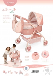 A Tulipe kollekció bájos babakocsija a gyönyörű spanyol dizájnt a mindennapi játékhoz szükséges praktikummal ötvözi. Finom lazacpasztell színei, virágminta és a tulipán alakú tematikus táska remek ajándékká teszik 3 éves kortól.