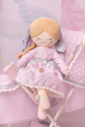 A 2025-ös SOPHIE kollekció romantikus megjelenésével tűnik ki, finom rózsaszín színben, melyet csipkék és masnik egészítenek ki világosszürke és fehér tónusokban. A baba védőcsomagolásban érkezik, így ajándékozásra kész.
