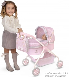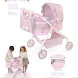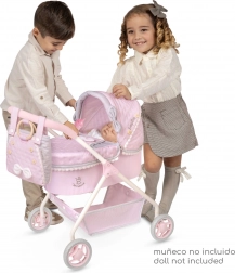 A praktikus felszereltséghez tartozik a levehető táska babakocsira vagy kézben hordva, mózeskosár-takaró fülekkel és zsebecskékkel, kényelmes matrac, valamint alsó tárolóhely az apróságoknak. A spanyol dizájn és a precíz kidolgozás hosszú élettartamot és mindennapi játékélményt biztosít.