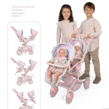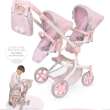 Játékos és praktikus – ez az összecsukható babakocsi két baba kényelmes szállítására készült. A dönthető és levehető üléseknek köszönhetően a babák a menetirányba nézve vagy azzal szemben is elhelyezhetők. A könnyű fém–műanyag váz, a puha textíliák és a SOPHIE kollekció finom, romantikus megjelenése remek kiegészítővé teszik a gyerekszobába.