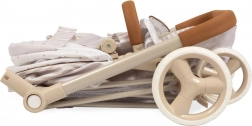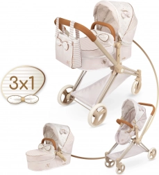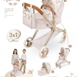 Elegáns 3 az 1-ben babakocsi babáknak a VERONA kollekcióból, finom természetes dizájnnal, összecsukható vázzal és levehető mély mózessal, amely sport változattá alakítható. Állítható kupolát, hárompontos övet, forgó első kerekeket a könnyű irányításhoz, valamint praktikus táskát és alsó kosarat kínál. Remek választás 3 éves kortól.
