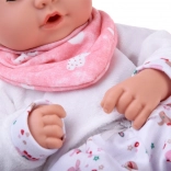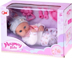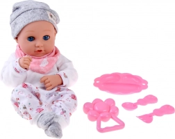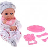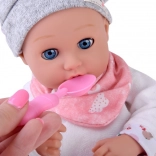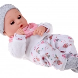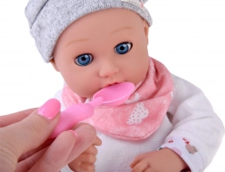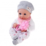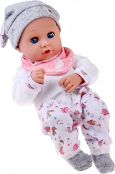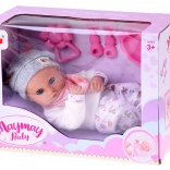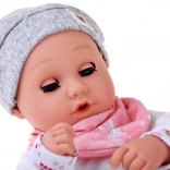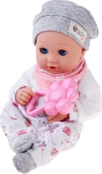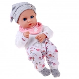 A baba kellemes, puha anyagból készült, tartós műanyag fejjel és kezekkel. A lágy színű öltözet szürke sapkát, puha blúzt, mintás nadrágot és szürke zoknit tartalmaz. A mozgó szemhéjaknak köszönhetően a baba élethűen utánozza az alvást és az ébrenlétet, ösztönözve a természetes gondoskodást és empátiát.
