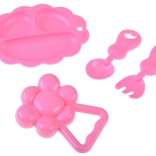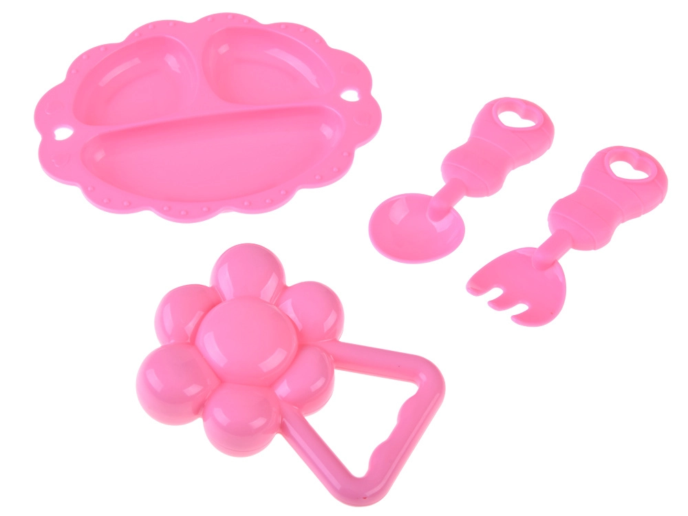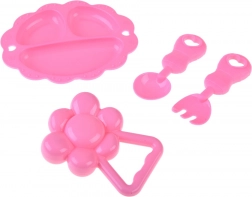 A rózsaszín tányérka, kanál, villa és csörgő segítik a szerepjátékot, valamint a fantázia és a finommotorika fejlődését.
