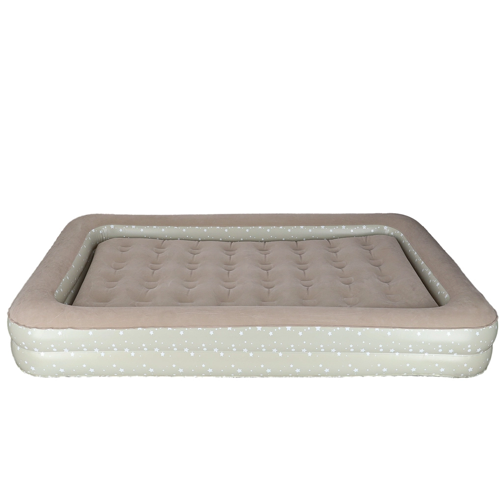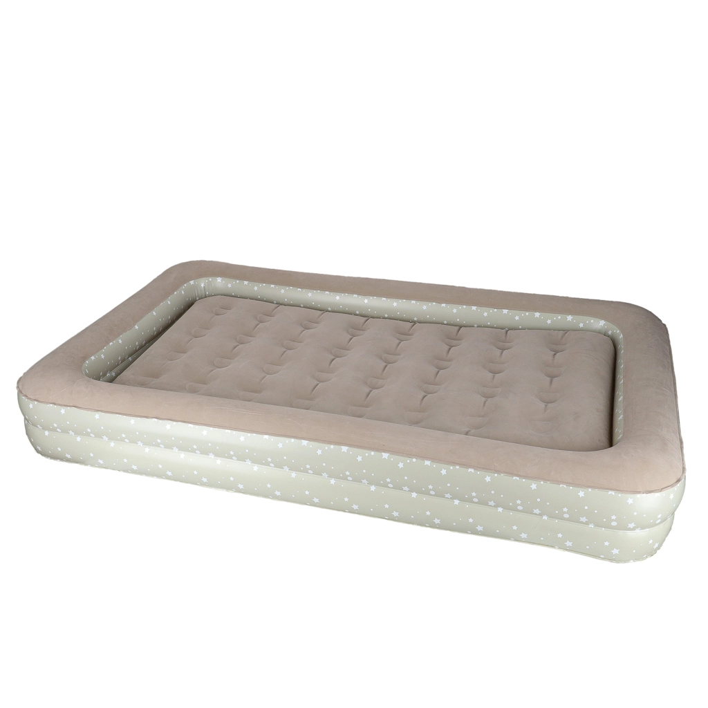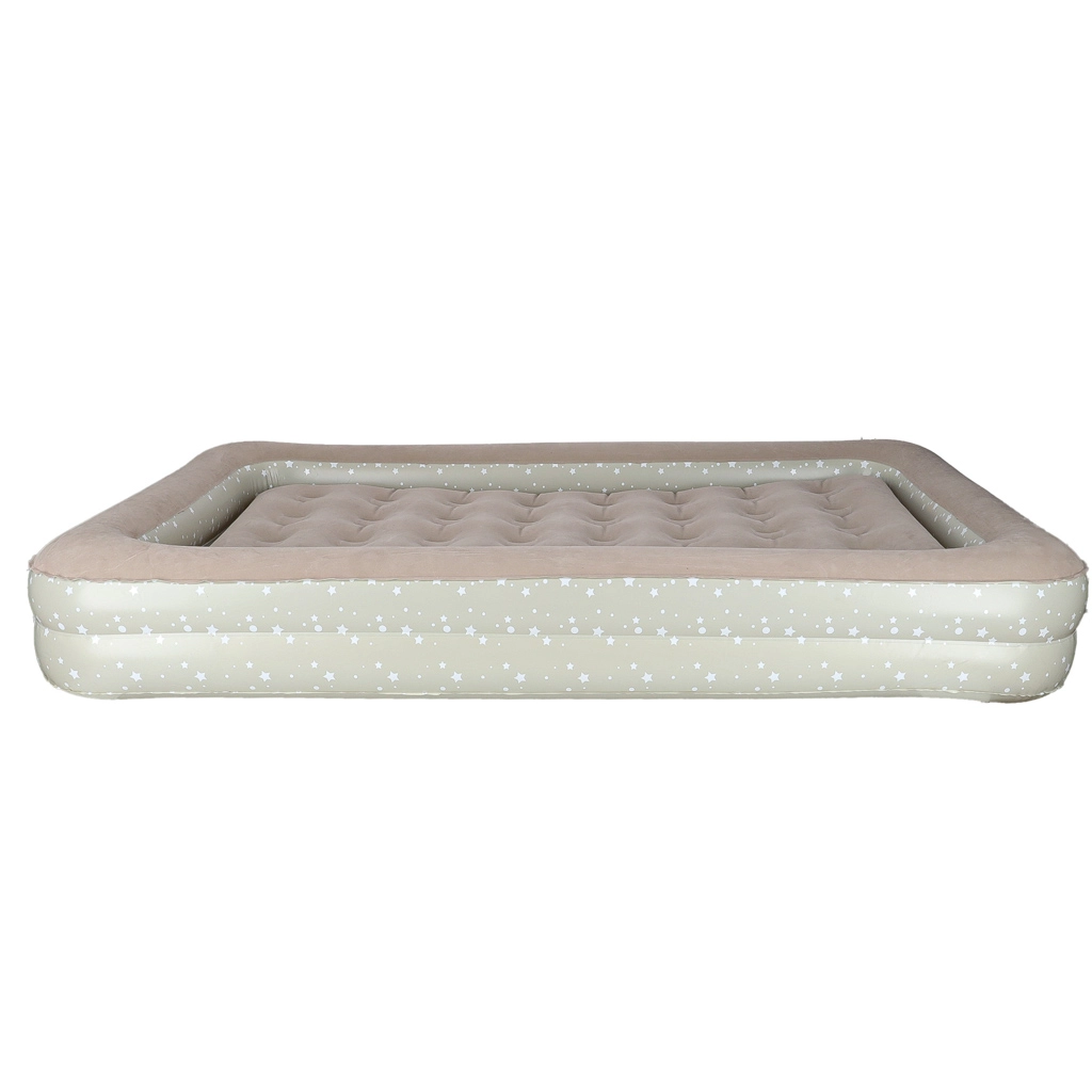 Teremtsen a gyerekeknek kényelmes és biztonságos környezetet bárhol – ez a kétrészes felfújható gyerekágy megemelt peremű külső keretet és kivehető belső matracot kombinál. A puha, flokkolt (velúr) felület kellemes tapintású, és megakadályozza az ágynemű csúszkálását. Az elegáns csillagmintás dizájn játékos megjelenést kölcsönöz az ágynak.