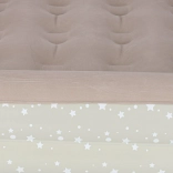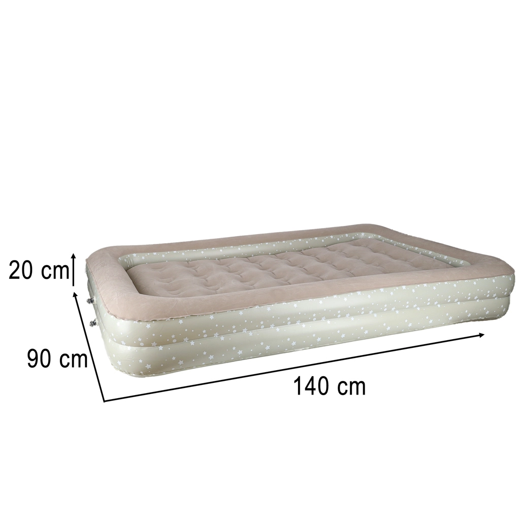 Praktikus, két részből álló felfújható gyerekágy biztonságos alváshoz megemelt peremekkel és külön belső matraccal. A csomag tartalma egy kézi pumpa különböző adapterekkel a gyors felfújáshoz, javítófolt és használati útmutató. Kényelmes velúr (szarvasbőr hatású) felület, csillagmintás dizájn és kompakt méret teszi ideális választássá utazáshoz, nagyszülőkhöz vagy váratlan vendégek számára. Terhelhetőség 50 kg-ig, méret 1 gyermek számára.