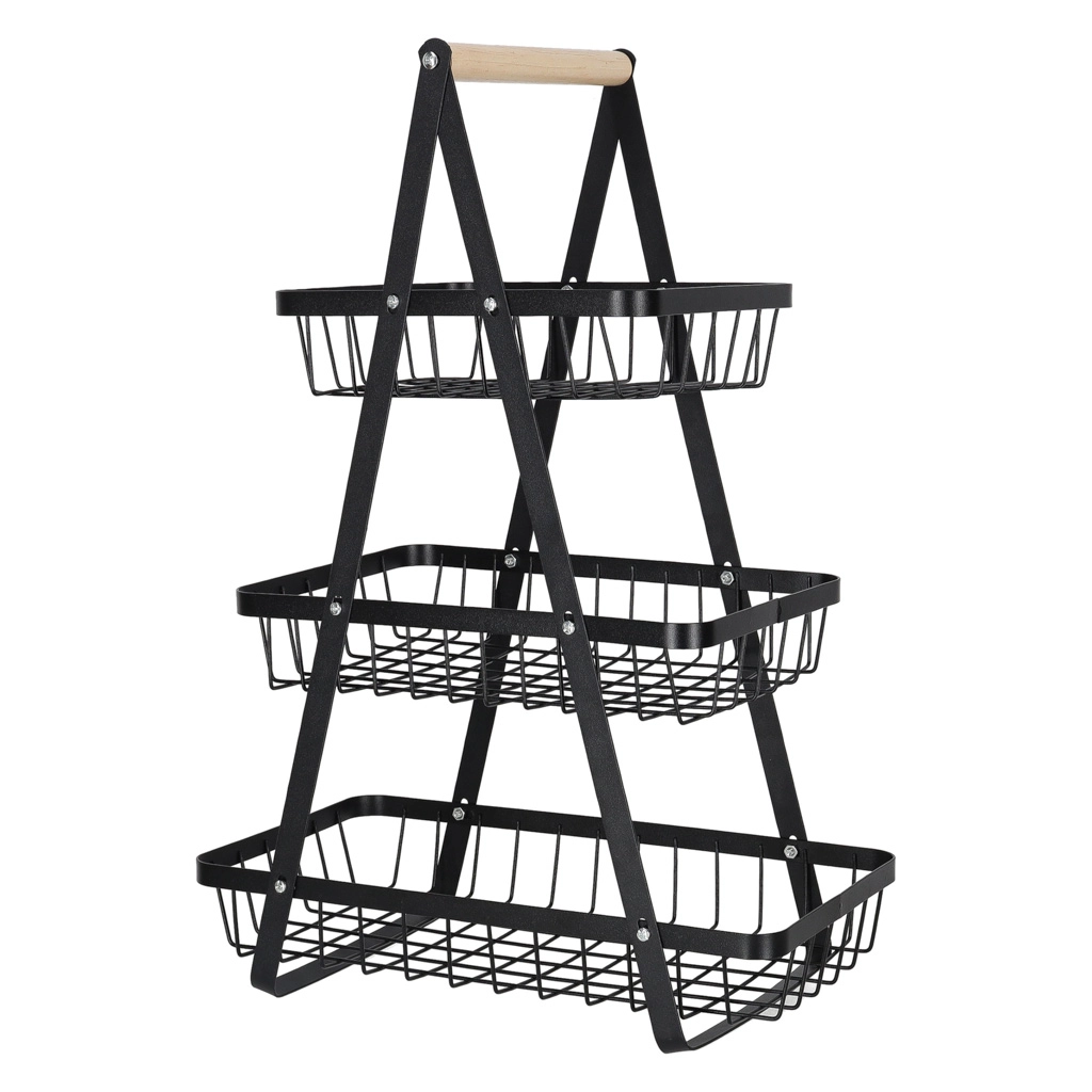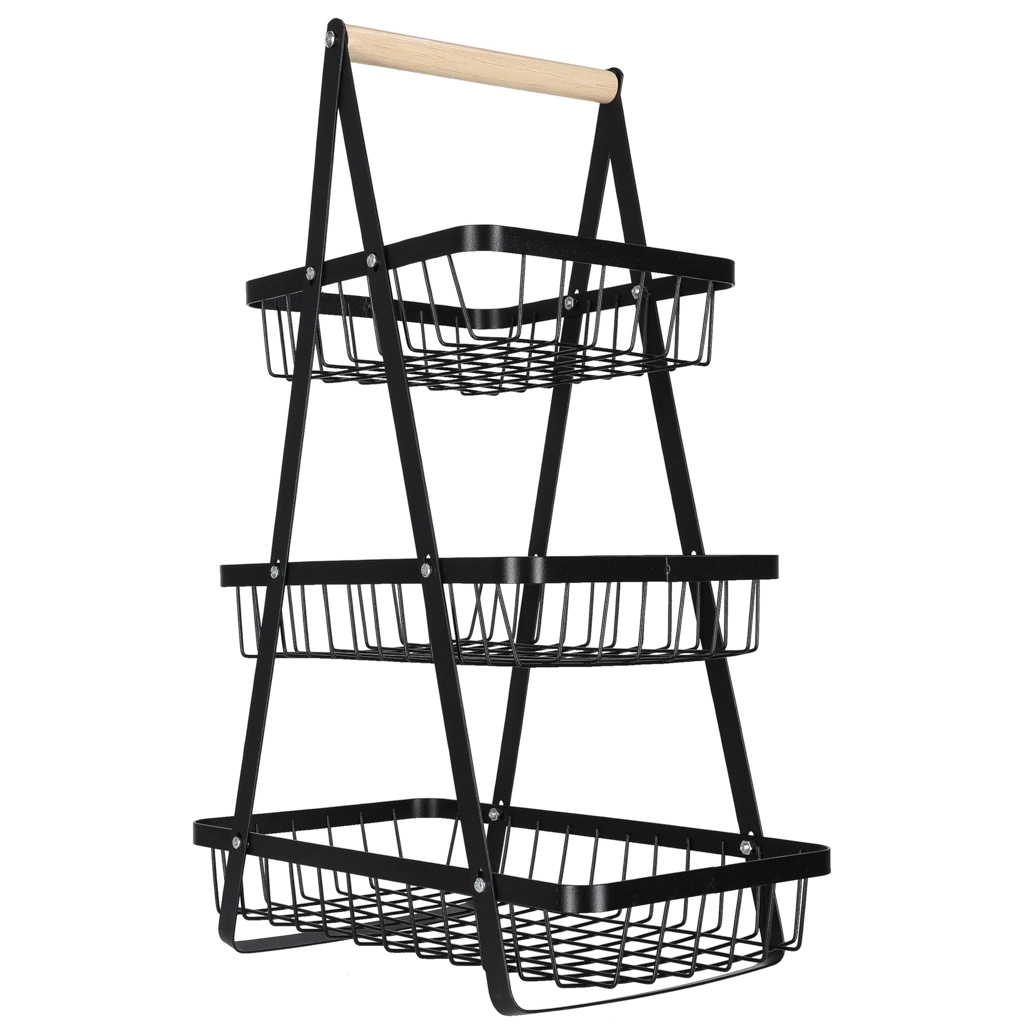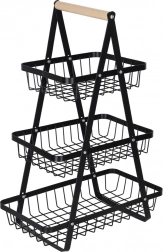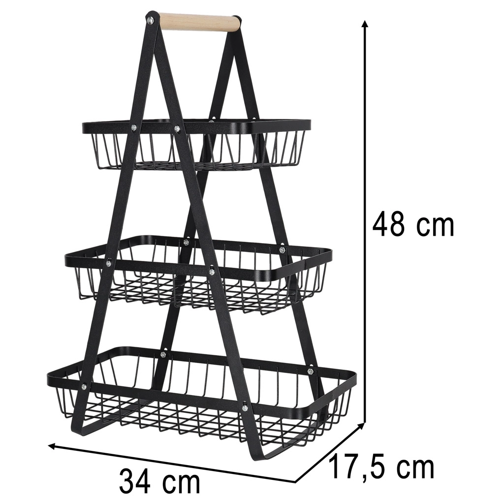 Stílusos háromszintes gyümölcskosár tartós fémből, fa fogantyúval, amely helyet takarít meg a konyhapulton és rendezetten tartja a konyhát. A három tágas kosár nyitott drótszerkezete biztosítja a levegő keringését, így a gyümölcs és zöldség tovább friss marad. Ideális péksüteményekhez, rágcsálnivalókhoz vagy fürdőszobai kiegészítőkhöz is.