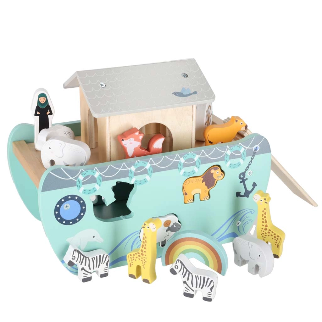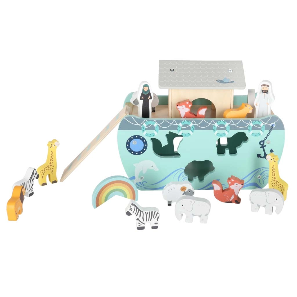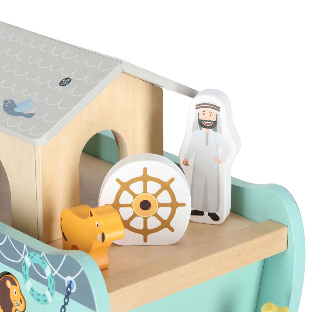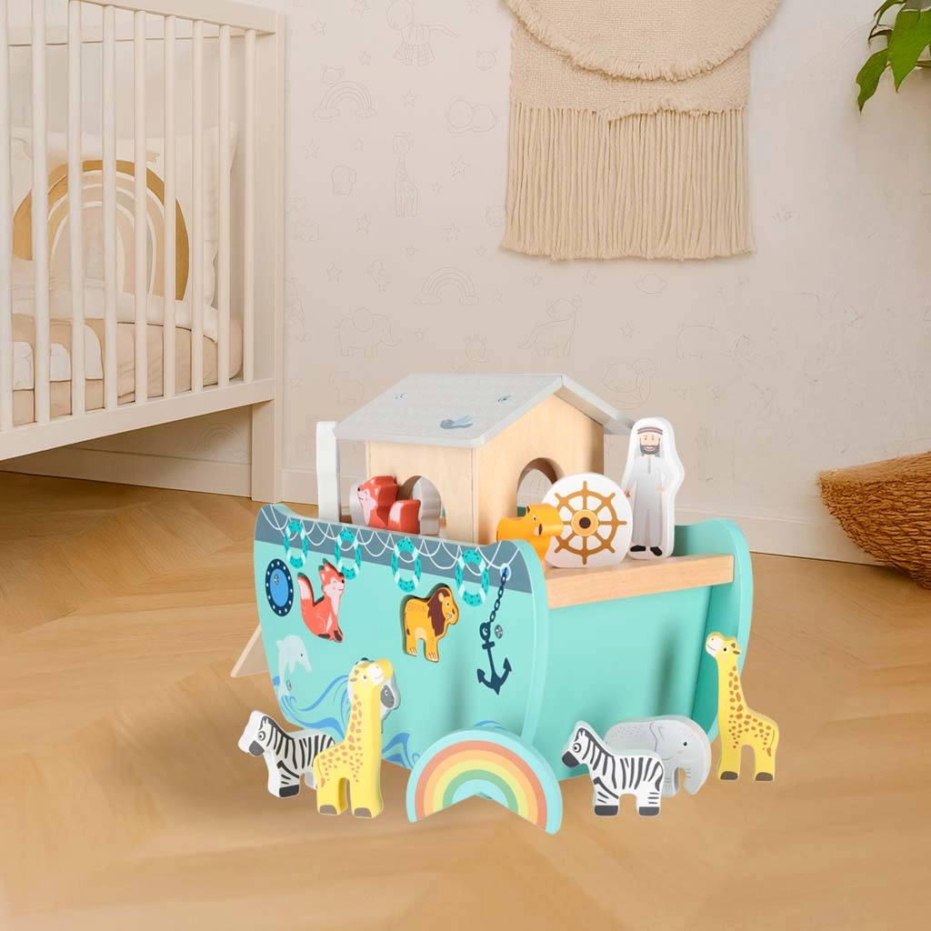 Fedezze fel a fa játékot, amely egyesíti a formaberakót, a szabad játékot és a történetmesélést. A levehető rámpával és tetővel ellátott bárka állatfigurák készletét és két szereplőt rejt – Noét és feleségét. A gyerekek megrakhatják a hajót, kormányozhatják, és a megfelelő nyílásokba illeszthetik az állatokat.