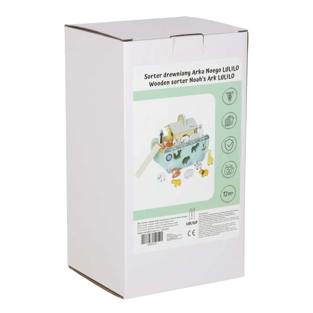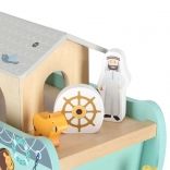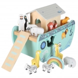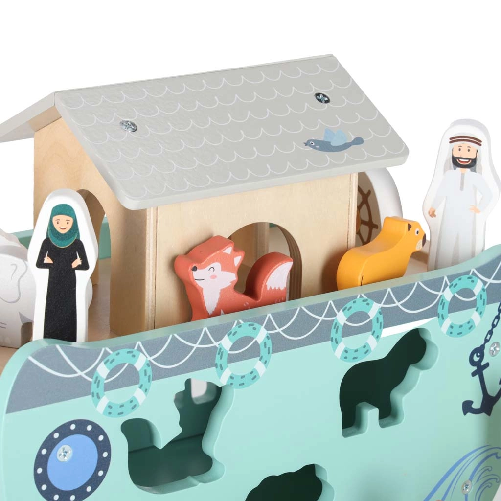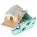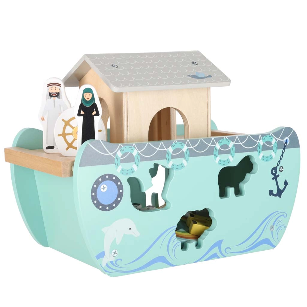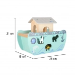 Fedezze fel a fa játékot, amely egyesíti a formaberakót, a szabad játékot és a történetmesélést. A levehető rámpával és tetővel ellátott bárka állatfigurák készletét és két szereplőt rejt – Noét és feleségét. A gyerekek megrakhatják a hajót, kormányozhatják, és a megfelelő nyílásokba illeszthetik az állatokat.