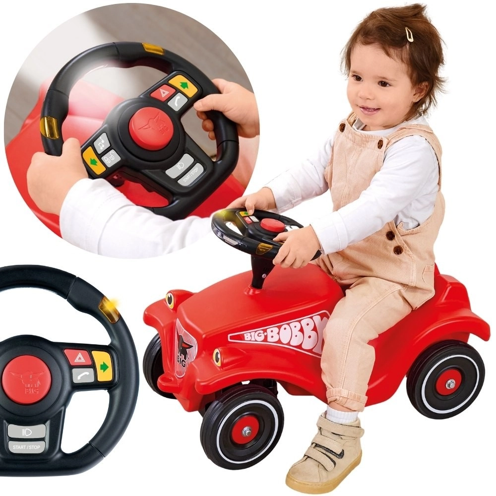 A multifunkciós BIG kormány igazi kalanddá varázsol minden utat a lábbal hajtós autón. A gyerekek értékelni fogják az LED-es irányjelzőket, a dudát, az indítás hangját, a rádiót és más valósághű effektusokat. Vízálló kialakításának köszönhetően kültéren is megállja a helyét.
