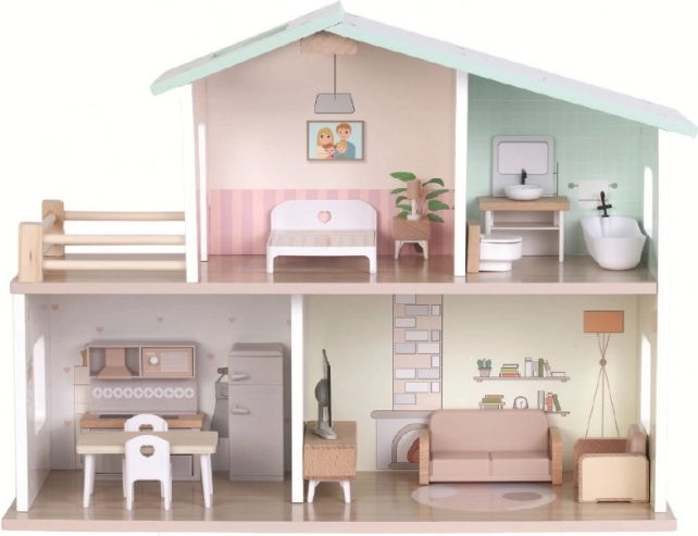 Anikó fa babaház a 2Kids Toys-tól. 16 elem, teljes felszerelés, minőségi kivitelezés, könnyű összeszerelés. Ideális 3 éves kortól.