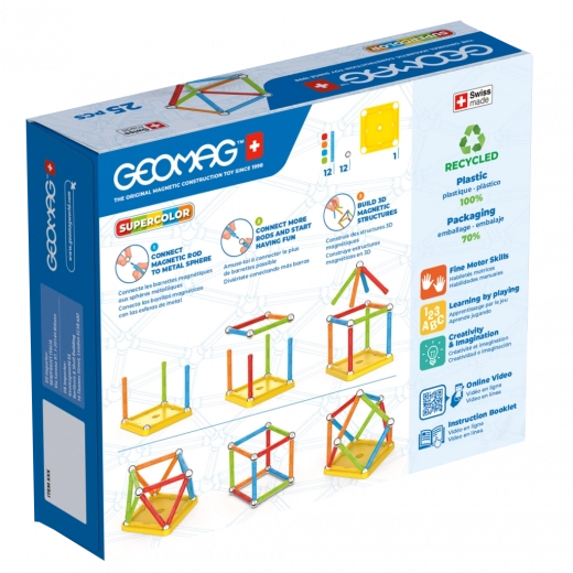 A GEOMAG Supercolor építőkészlet fejleszti a gyerekek fantáziáját, logikáját és finommotorikáját. A mágneses kapcsolatoknak köszönhetően a gyerekek könnyedén hozhatnak létre különféle formákat, tornyokat és alapvető geometriai konstrukciókat. A ragyogó színek és a masszív acélgolyók biztosítják a könnyű kapcsolódást és a stabilitást.