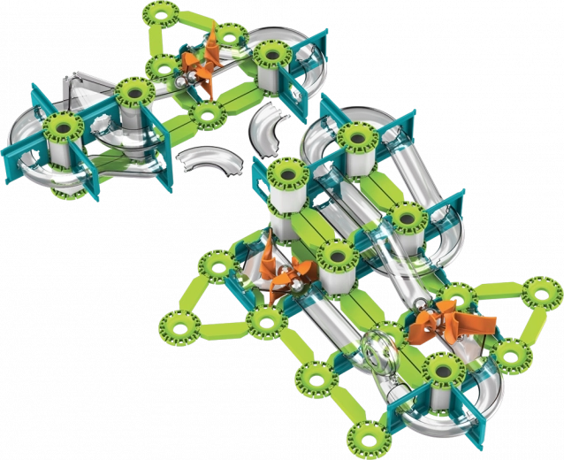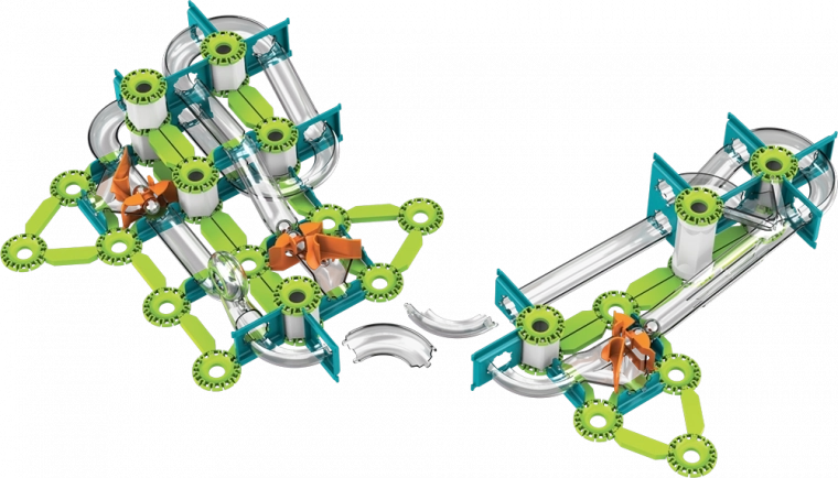 A zöld pályák, tartóelemek és narancssárga indítók könnyen összekapcsolhatók stabil útvonalakká. Az interaktív elemek kanyarokon és eséseken vezetik végig a golyókat.