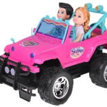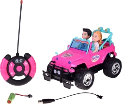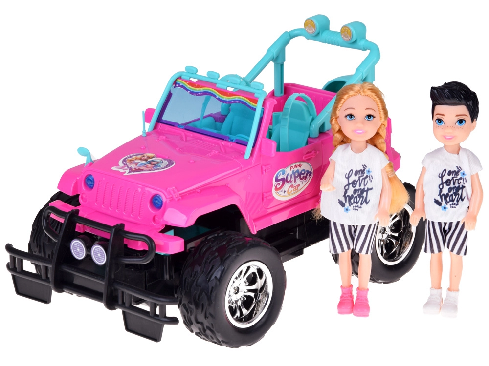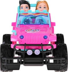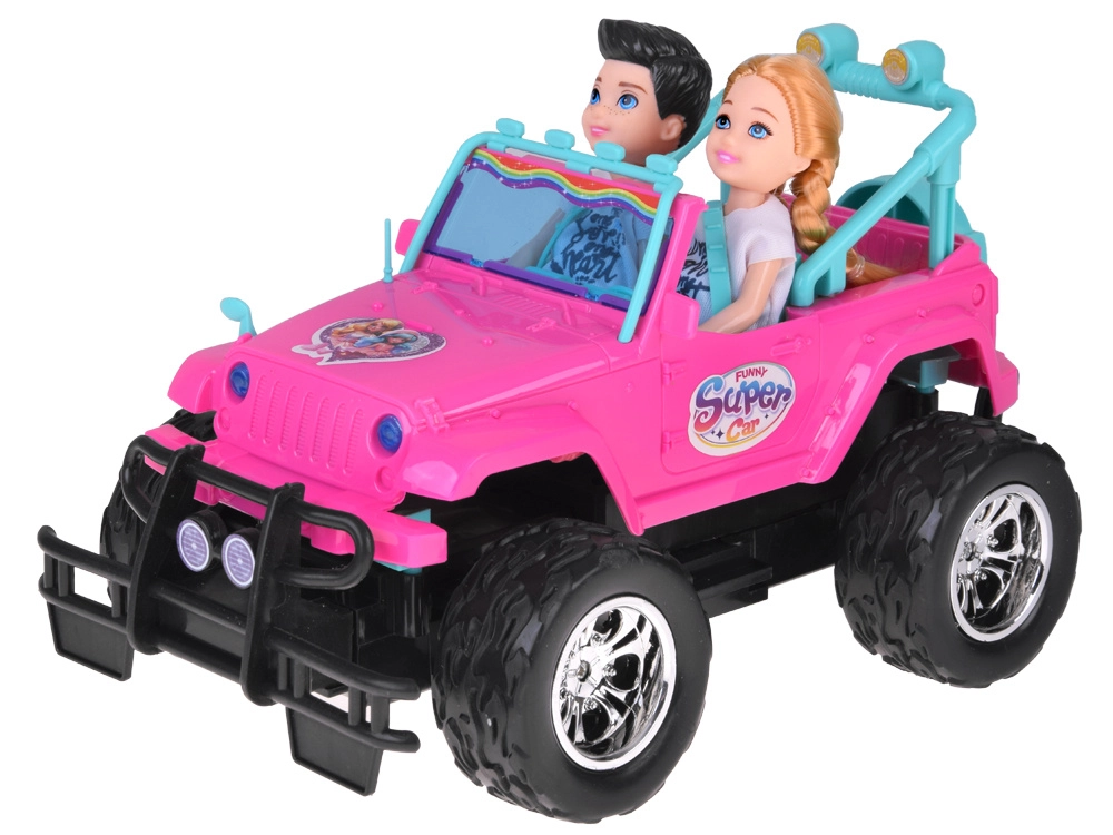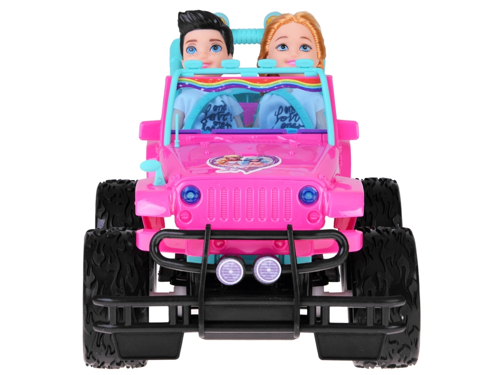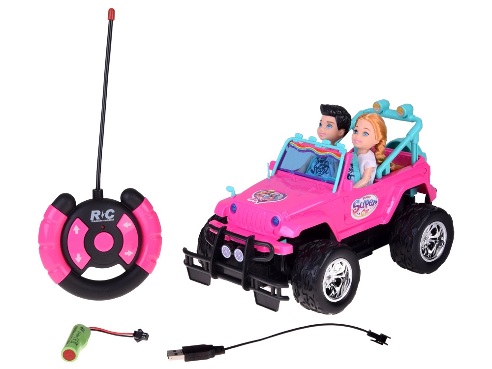 Szórakoztató készlet kislányoknak és kisfiúknak: rózsaszín RC terepjáró nagy kerekekkel és két figurával (lány és fiú). Az autó világító első lámpákkal, gumírozott abroncsokkal a jobb tapadásért, állítható biztonsági övekkel az üléseken és 4 irányú vezérléssel rendelkezik a rózsaszín távirányítóval. Tartozék a 3,7 V-os újratölthető akkumulátor USB-töltéssel.