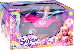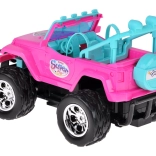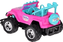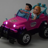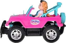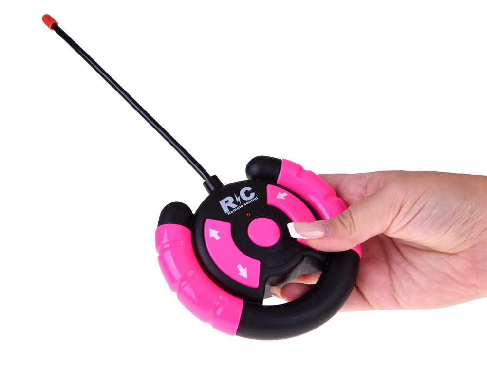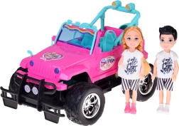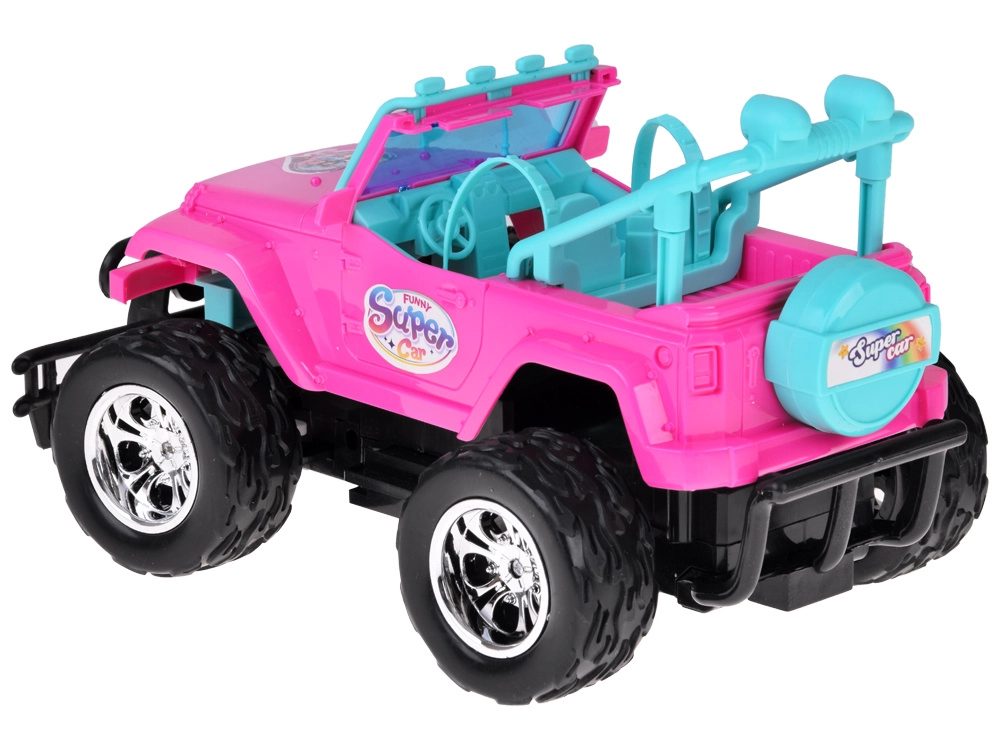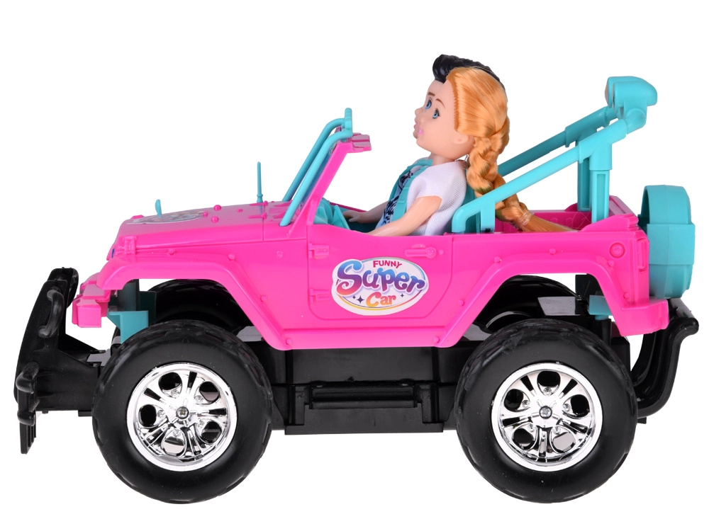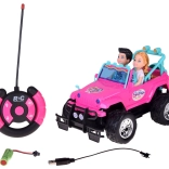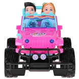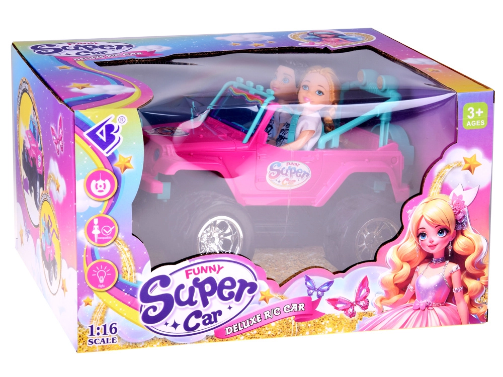 Szórakoztató készlet kislányoknak és kisfiúknak: rózsaszín RC terepjáró nagy kerekekkel és két figurával (lány és fiú). Az autó világító első lámpákkal, gumírozott abroncsokkal a jobb tapadásért, állítható biztonsági övekkel az üléseken és 4 irányú vezérléssel rendelkezik a rózsaszín távirányítóval. Tartozék a 3,7 V-os újratölthető akkumulátor USB-töltéssel.