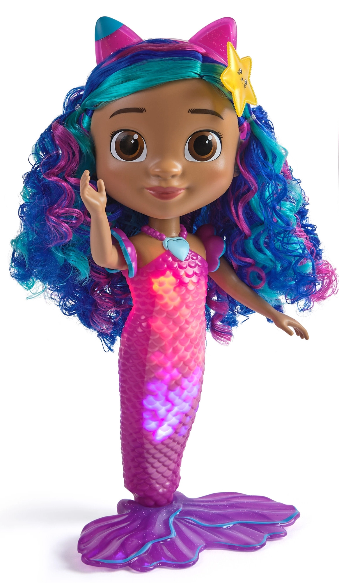 A baba vízálló, így a vízben is garantált a szórakozás. Feltűnő, kék–lila hullámos hajával, rózsaszín macskafüles hajpántjával és tengeri csillag kiegészítőjével ideális kreatív játékhoz, frizurakészítéshez és kiállításhoz. A halpikkely-textúrájú farok és a széles uszony stabil állást biztosít sík felületen.