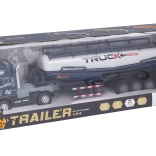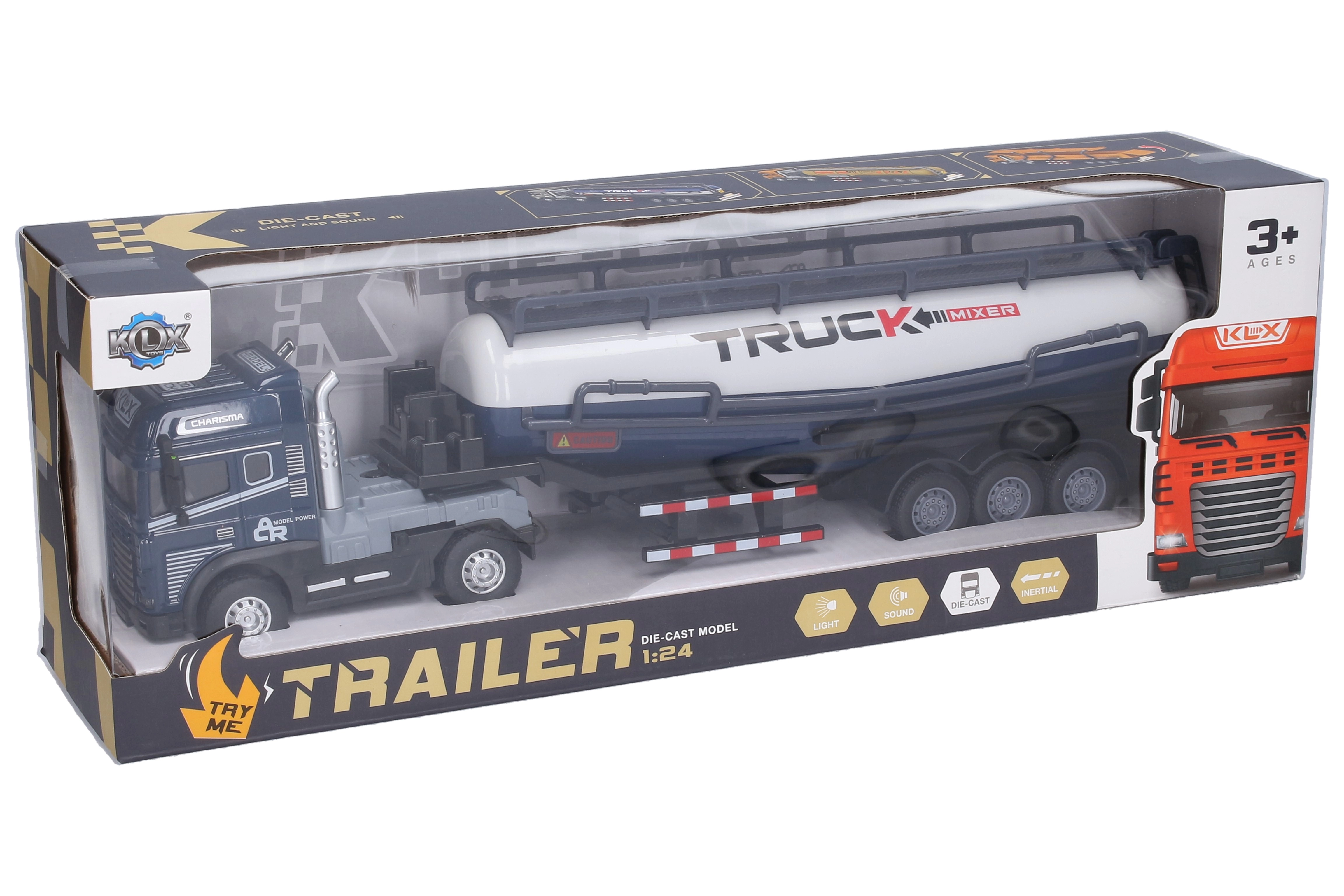 A valósághű fém tartálykocsis nyergesvontató örömet szerez a kis sofőröknek és a gyűjtőknek is. Kínál lendkerekes meghajtást a fürge haladáshoz, fény- és hangeffekteket, melyeket az első kerekek mozgása aktivál, valamint lecsatolható félpótkocsit praktikus reteszelő karral. Az elemek 3× AG13 a csomag részét képezik.