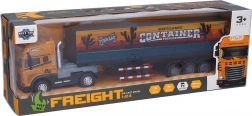 Realista fém nyergesvontató lekapcsolható konténeres pótkocsival, amely a kicsi és nagy sofőröket egyaránt lenyűgözi. Kínál fény- és hangeffekteket, lendkerekes meghajtást az egyenletes haladáshoz, nyitható konténerajtókat és az effektek aktiválását az első kerekek mozgatásával. A modell hossza 40 cm, az elemek 3× AG13 a csomag részét képezik.