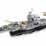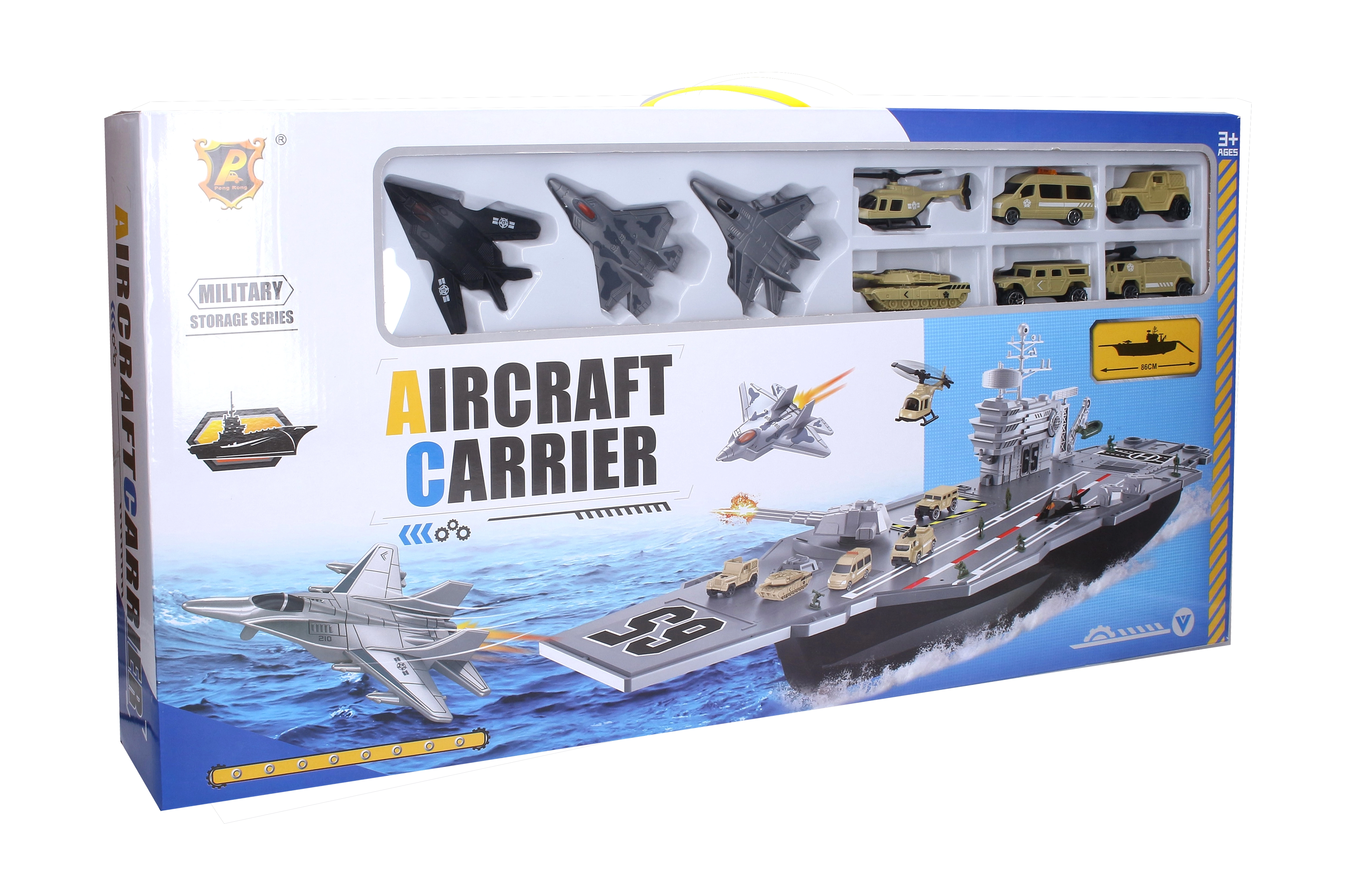 Nagy repülőgép-hordozó bőséges tartozékkal az akciódús játékhoz. Tartalmaz 5 szabadonfutó kerekű járművet, helikoptert, 3 vadászgépet, csónakot és katona figurákat. Ideális a katonai és légi jeleneteket kedvelő gyerekeknek. A hajó méretei: 86 × 19 × 21 cm. A csomag része egy képes útmutató az összeszereléshez és használathoz.