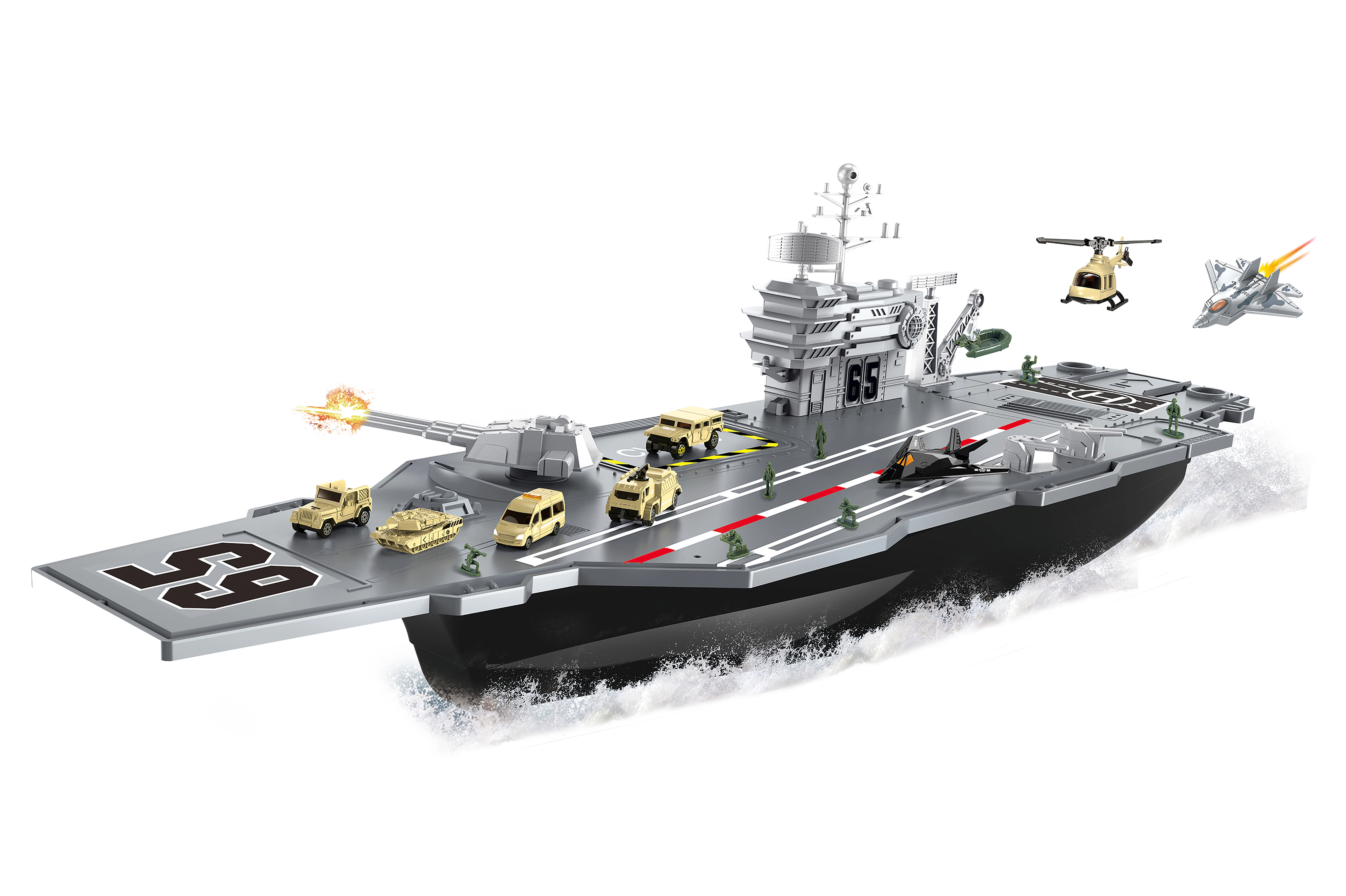Ez a részletesen kidolgozott repülőgép-hordozó órákon át tartó kreatív szórakozást kínál a gyerekeknek. A 86 × 19 × 21 cm-es nagy méretnek és a gazdag tartozékkészletnek köszönhetően valósághű leszállási, felszállási és tengeri küldetés-szcenáriók alkothatók. A járművek szabadonfutó kerekekkel rendelkeznek a sima mozgásért, a légi eszközök pedig készen állnak az akcióra.