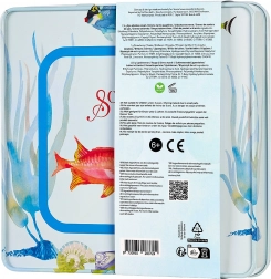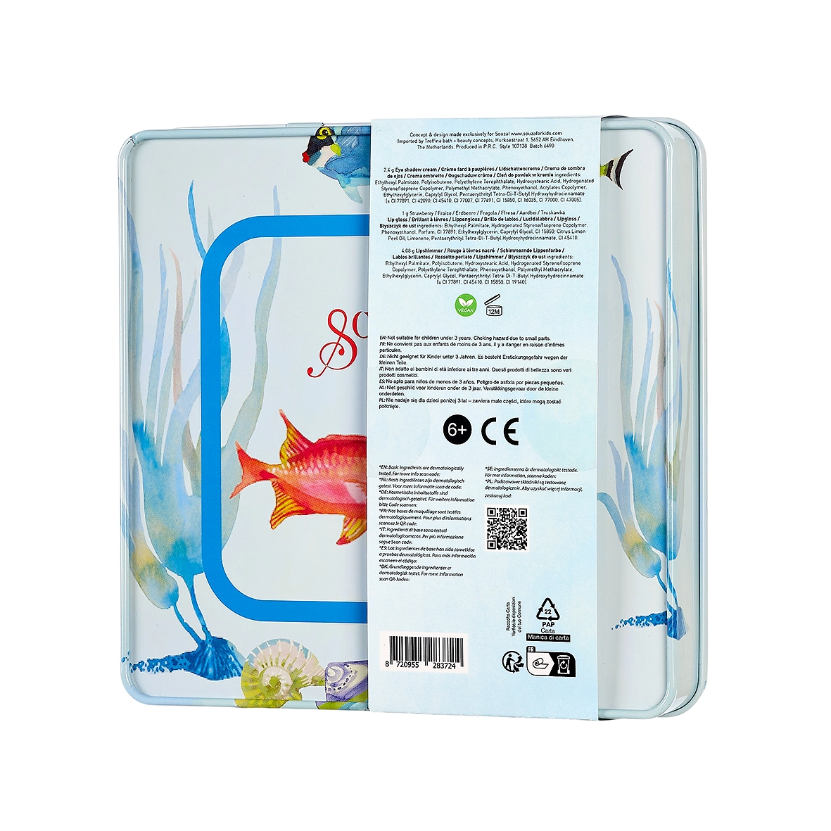 Elegáns gyerek sminkkészlet fém tokban, sellő mintával, amely 6 éves kortól örömet szerez a kis díva jelölteknek. Tartalmaz csillogó szemhéjpúdereket (rózsaszín, arany, kék), 6 krémes rúzst rózsaszín árnyalatokban és folyékony ajakfényt eper ízzel. A csomag része egy dupla applikátor. A kozmetikumok dermatológiailag teszteltek, könnyen lemoshatók, 100%-ban vegánok és állatkísérlet-mentesek.