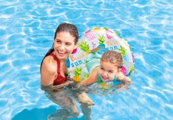Könnyű és tartós INTEX felfújható úszógumi 61 cm átmérővel, ideális vízi játékokhoz és az úszás elsajátításának első lépéseihez. Erős PVC-ből (0,18 mm) készült, színes mintákkal és kényelmes fogással. A minta véletlenszerűen kerül kiválasztásra.