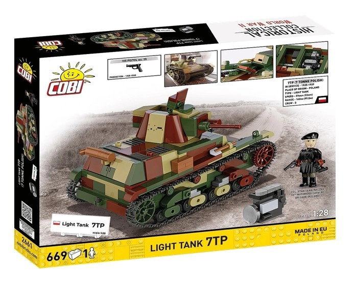 Építsd meg az ikonikus lengyel 7TP könnyű harckocsit 1:28 méretarányban egy készletből, amely 669 elemet és egy parancsnoki minifigurát tartalmaz. A modell a Lengyel Hadsereg Múzeumával együttműködésben készült, valósághű álcázást, forgatható tornyot, működő lánctalpat és tartós, matrica nélküli nyomatokat kínál. Remek választás történelemrajongóknak, gyűjtőknek és építőknek.