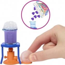A szett tartalmaz egy speciális lombikot termochromikus hatással a színváltós játékhoz, valamint további laboratóriumi eszközöket, amelyek fejlesztik a finommotorikát, a kreativitást és a kíváncsiságot. A baba batikolt ruhát, sportcipőt és fehér laborköpenyt visel – készen áll minden tudományos kalandra.