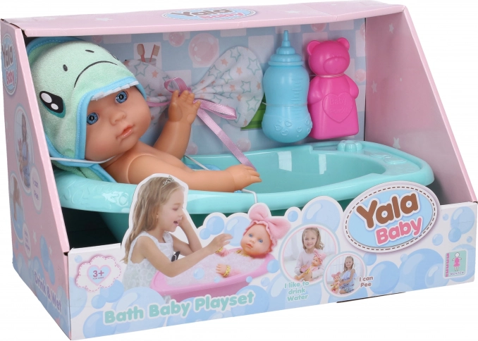 - Teljes fürdőszett – baba, kád, fürdőkellékek és köntös.