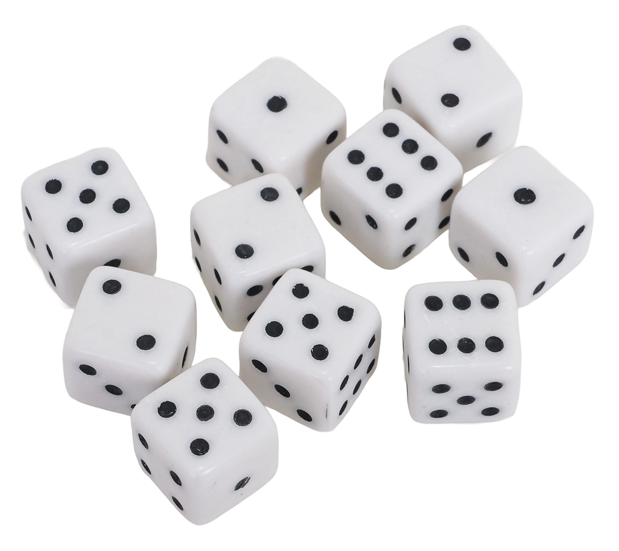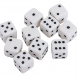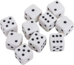 A készlet 10 darab fehér kockát tartalmaz fekete pöttyökkel a jó olvashatóság és univerzális használat érdekében.