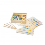 A gyöngyök zsinórra és fa pálcikákra fűzése támogatja az ujjak ügyességét és a szem-kéz koordinációt, ideális az óvodai készségekhez.