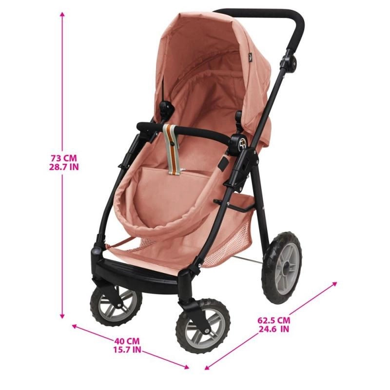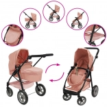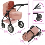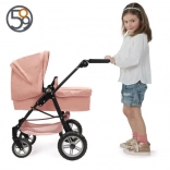 Stílusos 2 az 1-ben babakocsi rózsaszín kivitelben, luxus kidolgozással, levehető üléssel és átalakítható sport babakocsivá. A állítható tolókar, a forgó első kerék és a nagy kosár miatt ideális a kis anyukáknak. Körülbelül 53 cm-es babákhoz alkalmas.