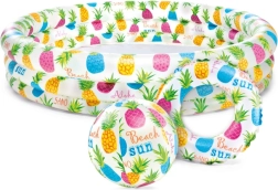 A vidám trópusi/gyümölcsös mintájú felfújható gyermekmedence biztonságos és szórakoztató helyet teremt a nyári felfrissüléshez. A három különálló légkamra stabilitást és kényelmet nyújt, míg a csomagban található úszógumi és felfújható labda még több játékélményt ad.
