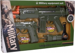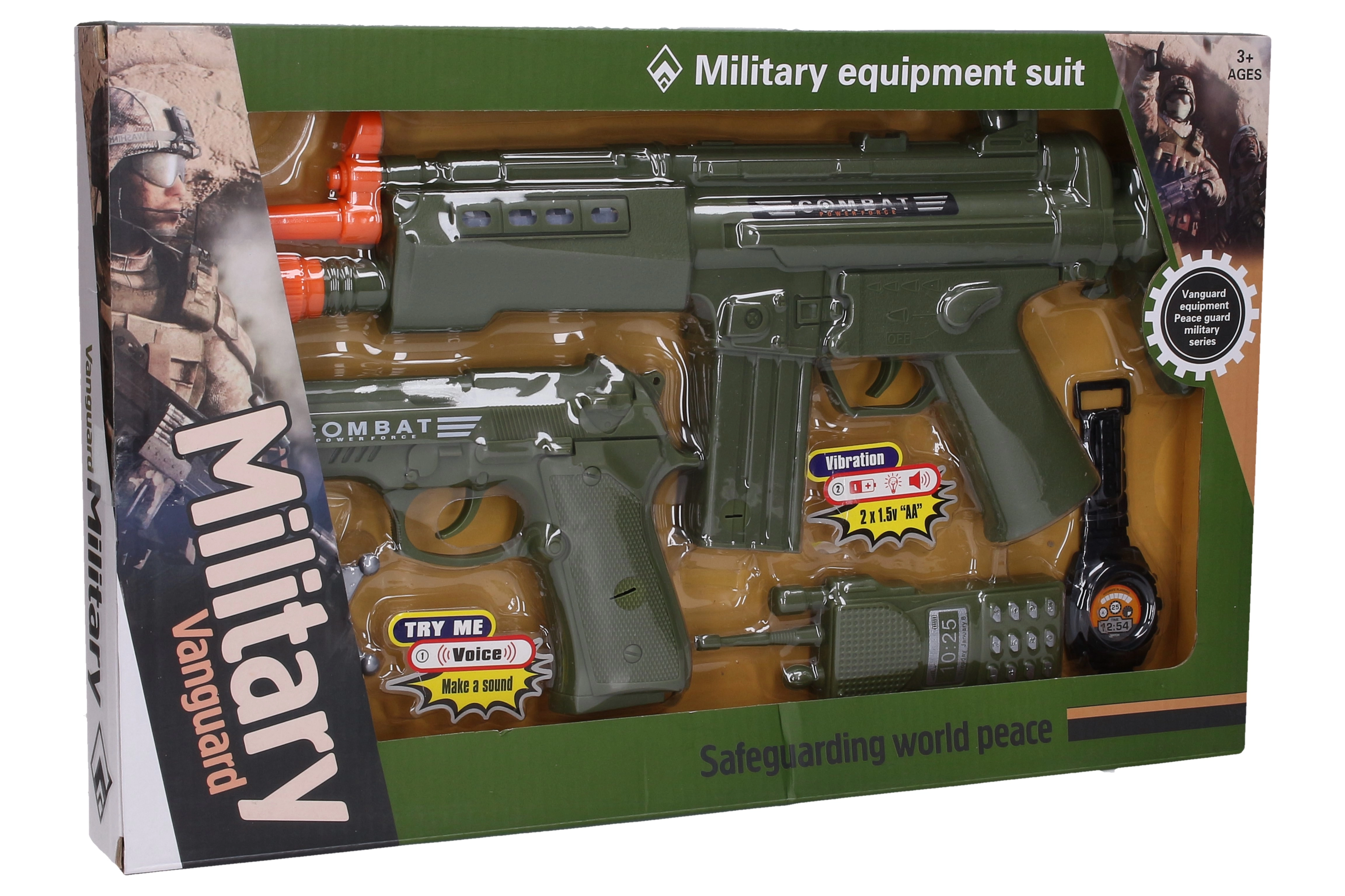 Teljes katonai készlet kis kalandoroknak: gépfegyver, pisztoly, jelvény, rádió és óra. A játék fény- és hangeffekteket ad, amelyek fokozzák a játékélményt. A gépfegyver 2× AA elemmel működik (a csomag tartalmazza), így a gyerekek azonnal játszhatnak.