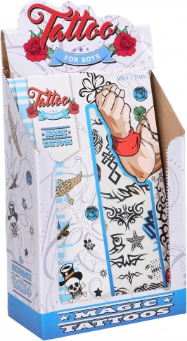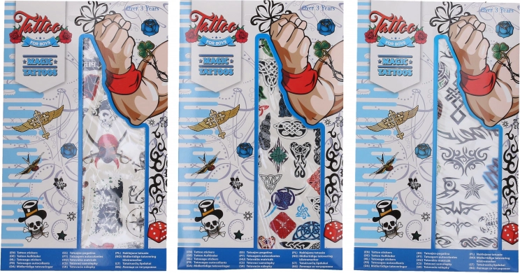 Fedezze fel a gyerekek által imádott, ideiglenes tetoválásokat tartalmazó szettet. Minden ív vagány motívumokat kínál fiúknak, a használat pedig gyerekjáték – csak helyezze fel, nedvesítse be, és már kész is. Rövid távú bőrdíszítéshez, elköteleződés nélkül.
