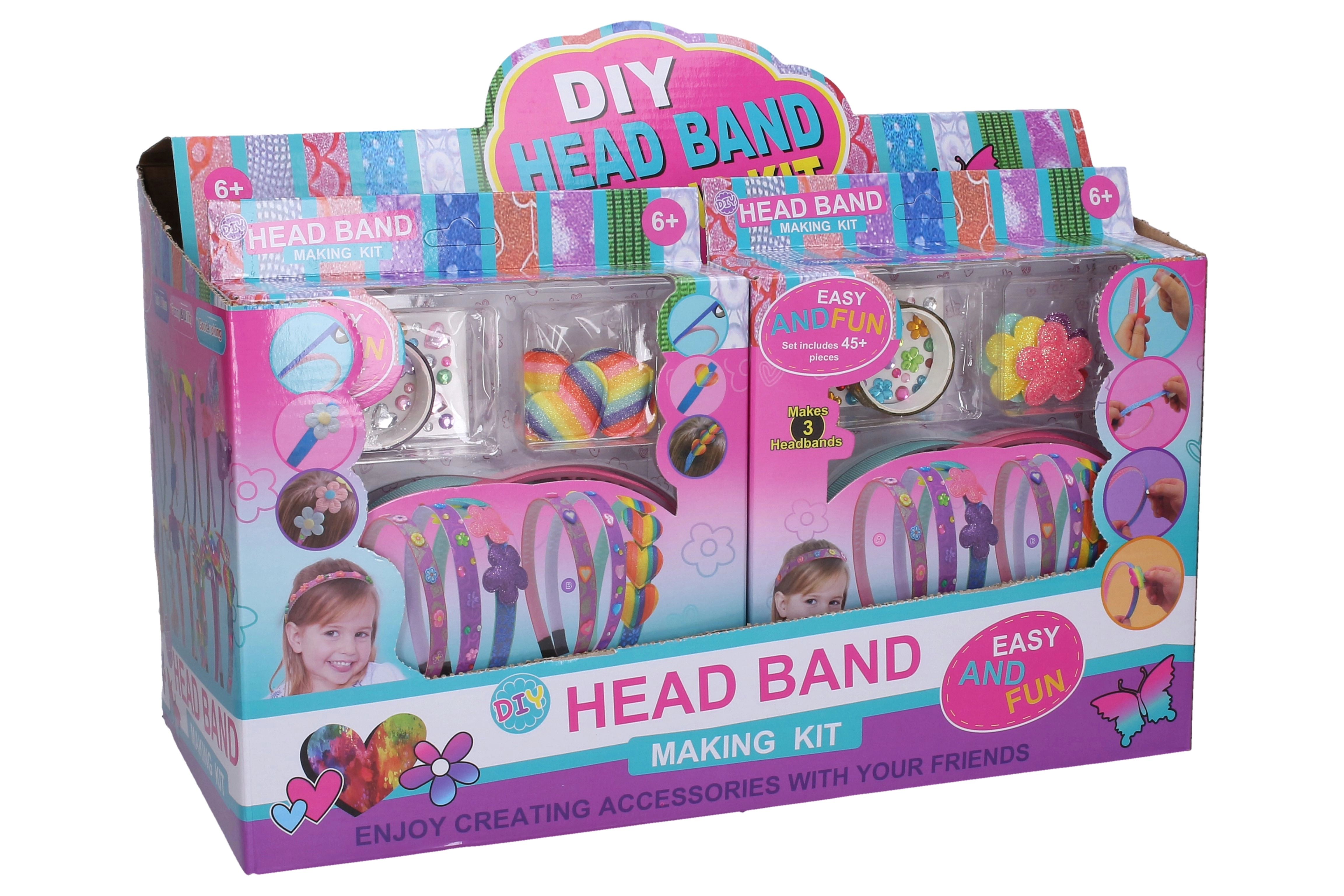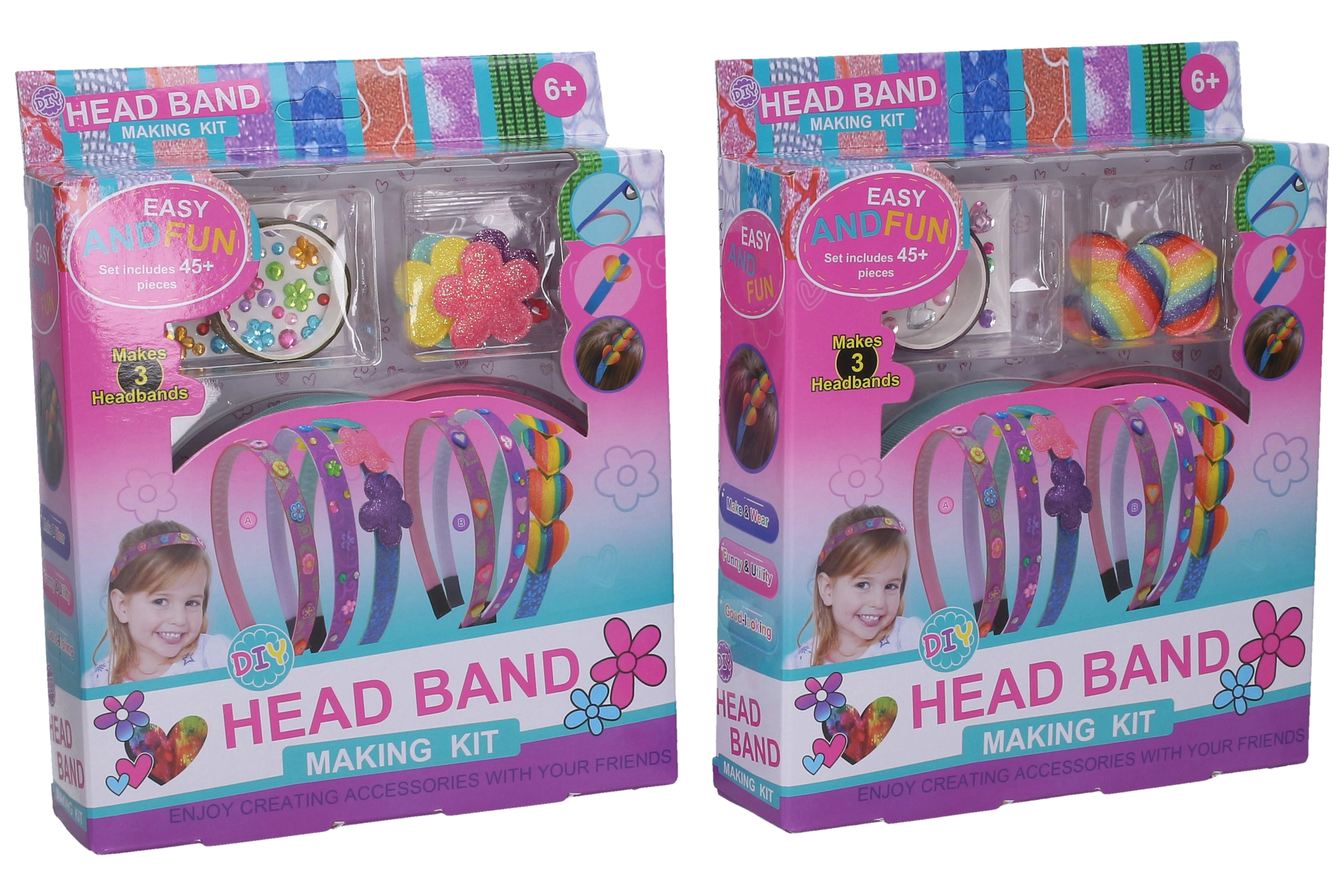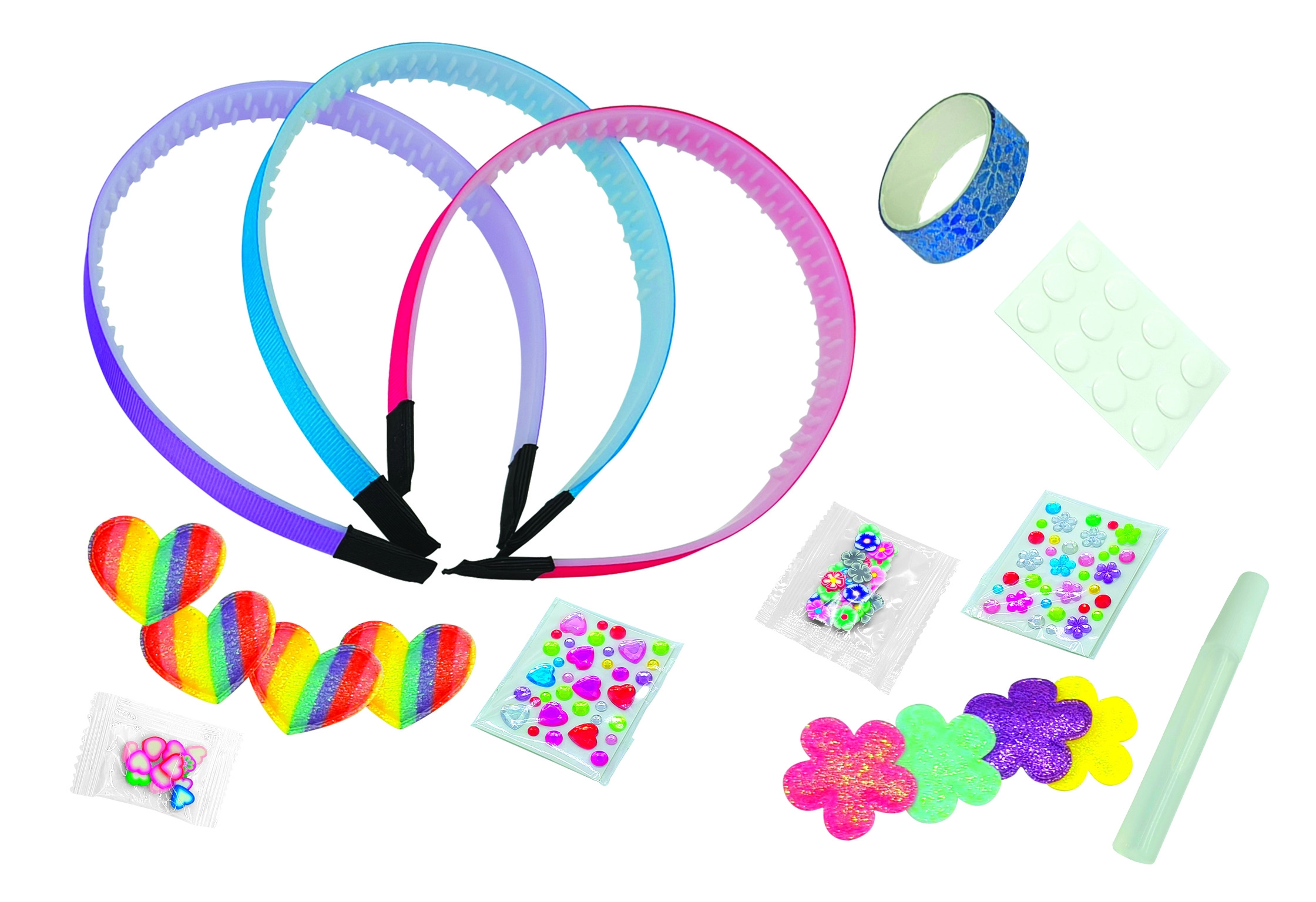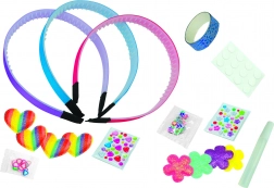 A készlet tartalmaz alap műanyag fejpántokat és bőséges kiegészítőválasztékot, így a gyerekek könnyen megtervezhetnek három különböző stílust – a finom, virágos daraboktól a csillogó és játékos változatokig.