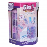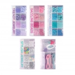 Praktikus készlet a karkötők készítéséhez áttekinthető, 27 cm hosszú szekrénykével. Tartalmaz 5 doboz gyöngyöt és zsinórokat egyedi dizájnhoz, a dobozok függőleges elhelyezésének lehetőségét a jobb rendszerezésért, helyet a kész karkötők tárolására, valamint fogantyút a könnyű hordozáshoz.