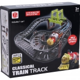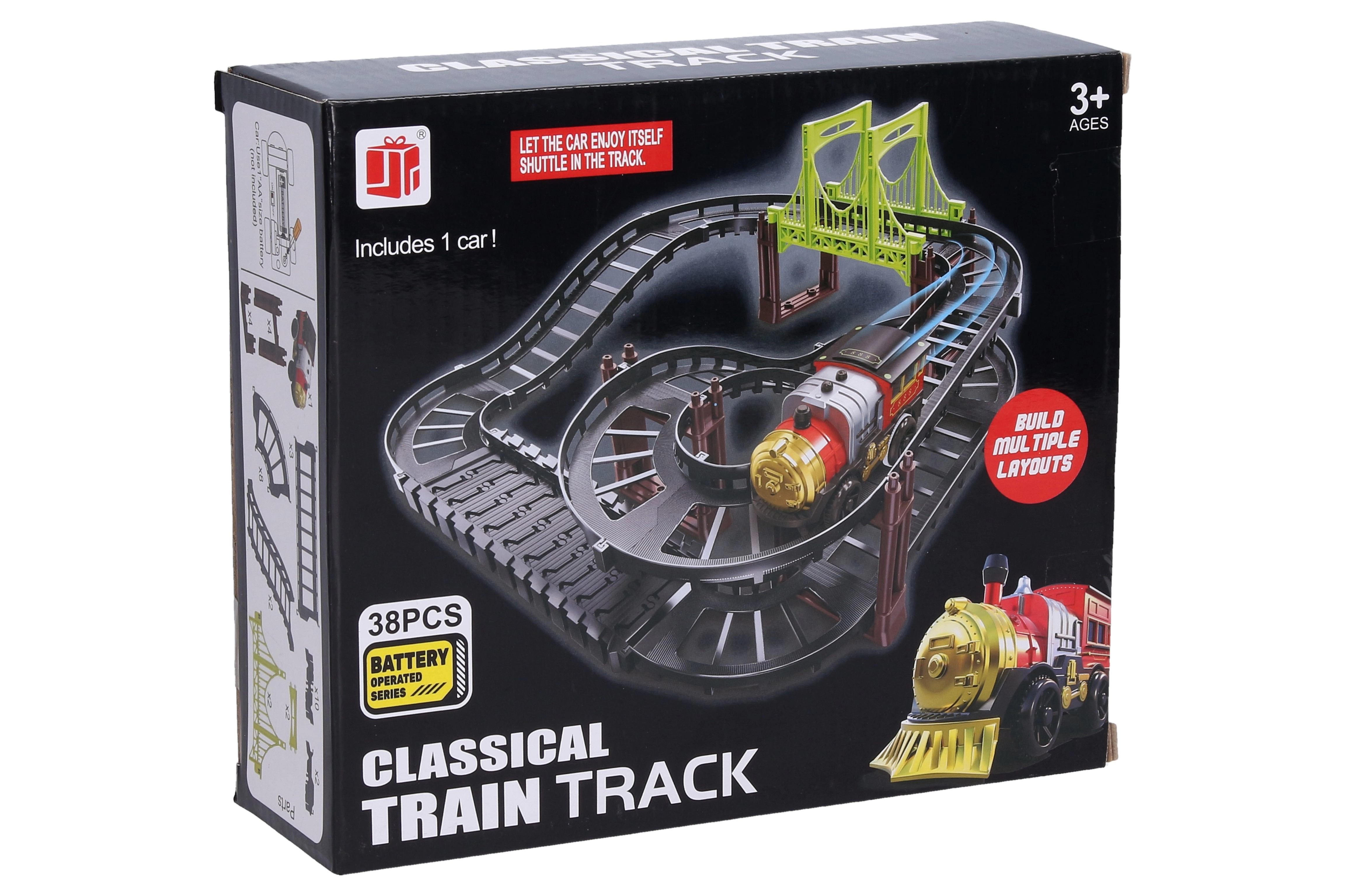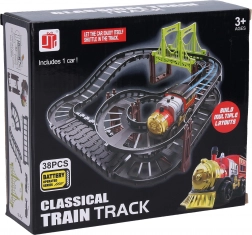 Szórakoztató gyermek vasútpálya egyszerű vezérléssel és gyors összeszereléssel. A elemes mozdony ON/OFF kapcsolóval indítható, a készlet 38 elemet tartalmaz, és kompakt méreteivel 31 × 32 × 14 cm örömet szerez. Ideális ajándék a kis vonatrajongóknak.