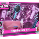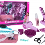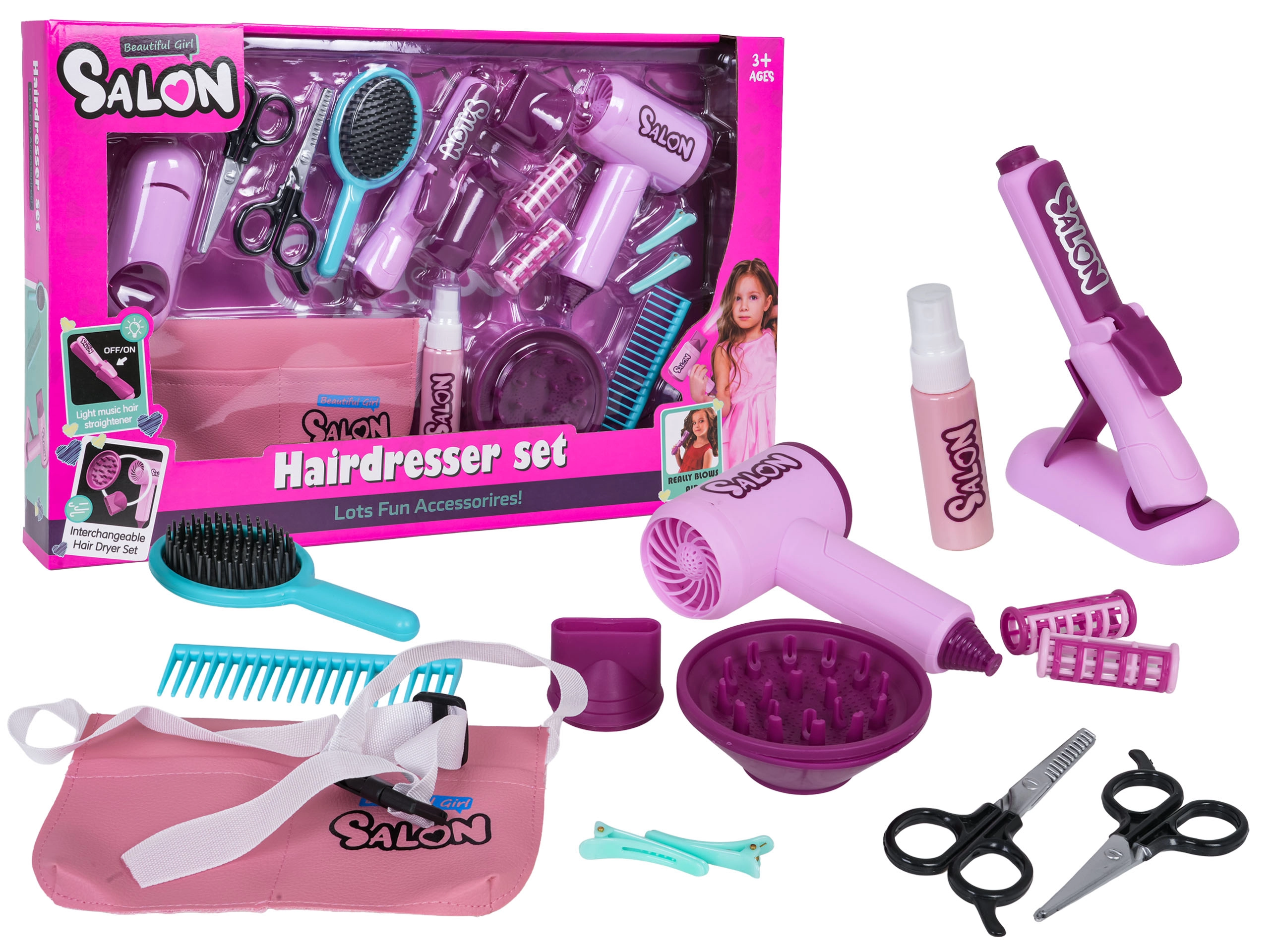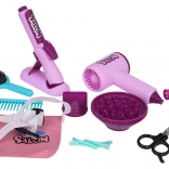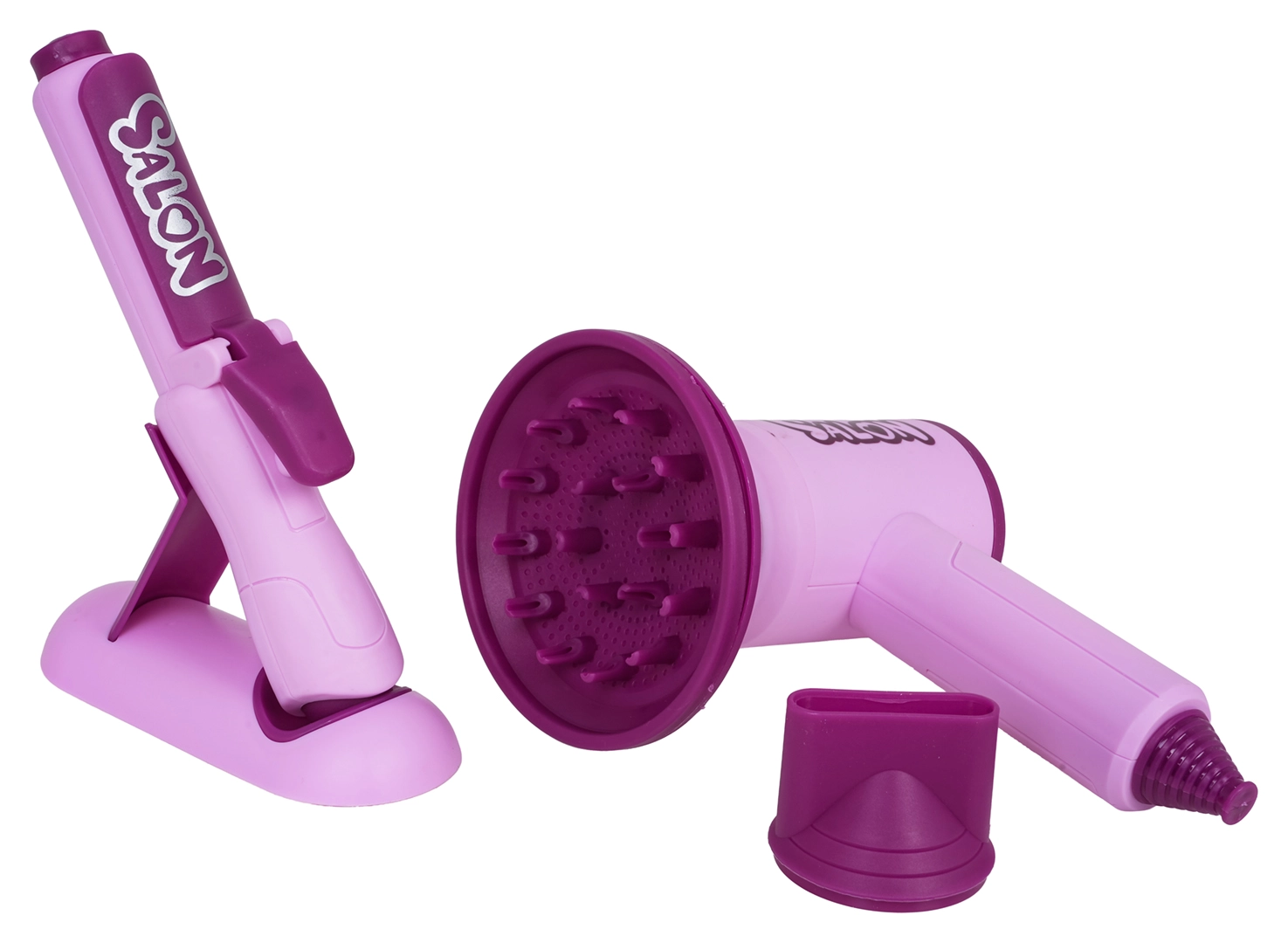 A szett része egy gyerek hajszárító két fejjel (diffúzor és koncentrátor), amely szárítási hangot ad és gyenge légáramot biztosít az autentikus élményért. A gyerek hajvasaló gombelemmel működik, és fényhatással rendelkezik. A készletet kiegészíti fésű, kefe, olló, ritkító olló, csatok, hajcsavarók és egy „kozmetikai” flakon – tökéletes a kreatív játékhoz és a finommotorika fejlesztéséhez.