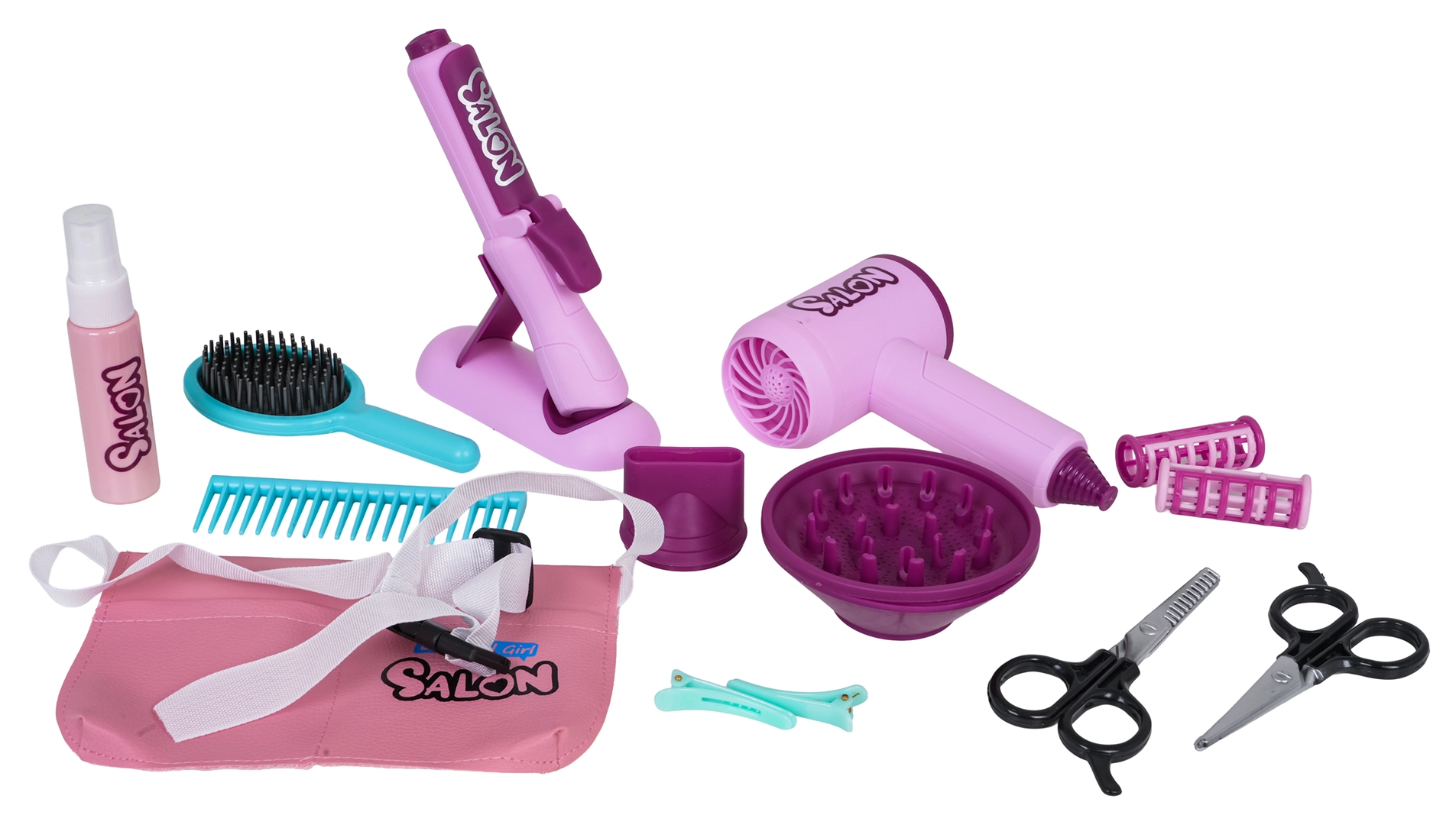 Fedezd fel a saját szalon varázsát ezzel a gazdagon felszerelt szettel 3 éves kortól. Találsz benne működő gyerek hajszárítót cserélhető fejekkel, világító hajvasalót, hajsütővasat, fésűt, kefét, csatokat, hajcsavarókat, ollót és egy praktikus rózsaszín övtáskát. A hajszárító hangot ad és enyhe „légfúvást” biztosít, a hajvasaló világít – ideális a valósághű fodrászos szerepjátékhoz.