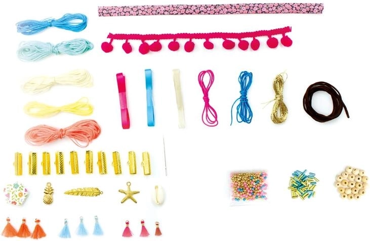 - 25 m pamut fonal, 1,5 m viaszos fonal, 100 gyöngy, 16 fa gyöngy, 30 gyöngy tubusban, 25 cm bőr zsinór, 25 cm bojtokkal díszített szalag, 3 acél medál, 1 kagyló, 1 mintás gyöngy, 75 cm szalag, 5 lánc kapoccsal, 10 nagy kapocs, 1 tű, 9 bojt, 25 cm mintás szalag, 5 karkötőrögzítő, 2 karkötőállvány