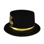 Stílusos fekete kalap arany szegéllyel és feltűnő HAPPY NEW YEAR felirattal – tökéletes kiegészítő szilveszteri bulikra és újévi ünneplésre. Könnyű és kényelmes viselet, luxus, ünnepi megjelenést ad az outfitednek, és fotórekvizitának is remek.
