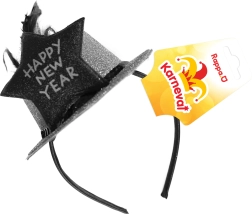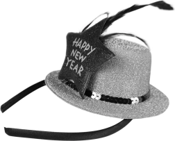 Stílusos fejpánt mini kalappal arany színben és HAPPY NEW YEAR felirattal – tökéletes kiegészítő szilveszteri bulira és partikra. A könnyű kalap gumikkal rögzül kényelmesen, így jól tart és nem zavar tánc közben.