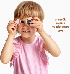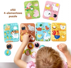 A készlet 6 aranyos, négyrészes farmjelenetet és 12 kiegészítő korongot tartalmaz – minden puzzle-hoz 2 zseton tartozik. A gyerekek először kirakják a képet, majd a megfelelő korongokat illesztik a kijelölt helyekre. A színes illusztrációk motiválnak a felfedezésre és segítik a jól ismert állatok felismerését.