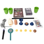 • Bűvészkellékek: pálca, poharak és labdák, eltűnő pénzérme-doboz, kártyapakli, kötél, ujj, tojás és további kiegészítők.