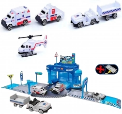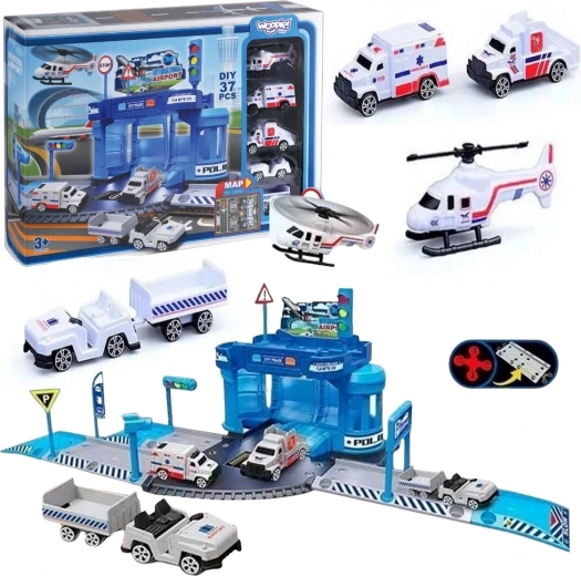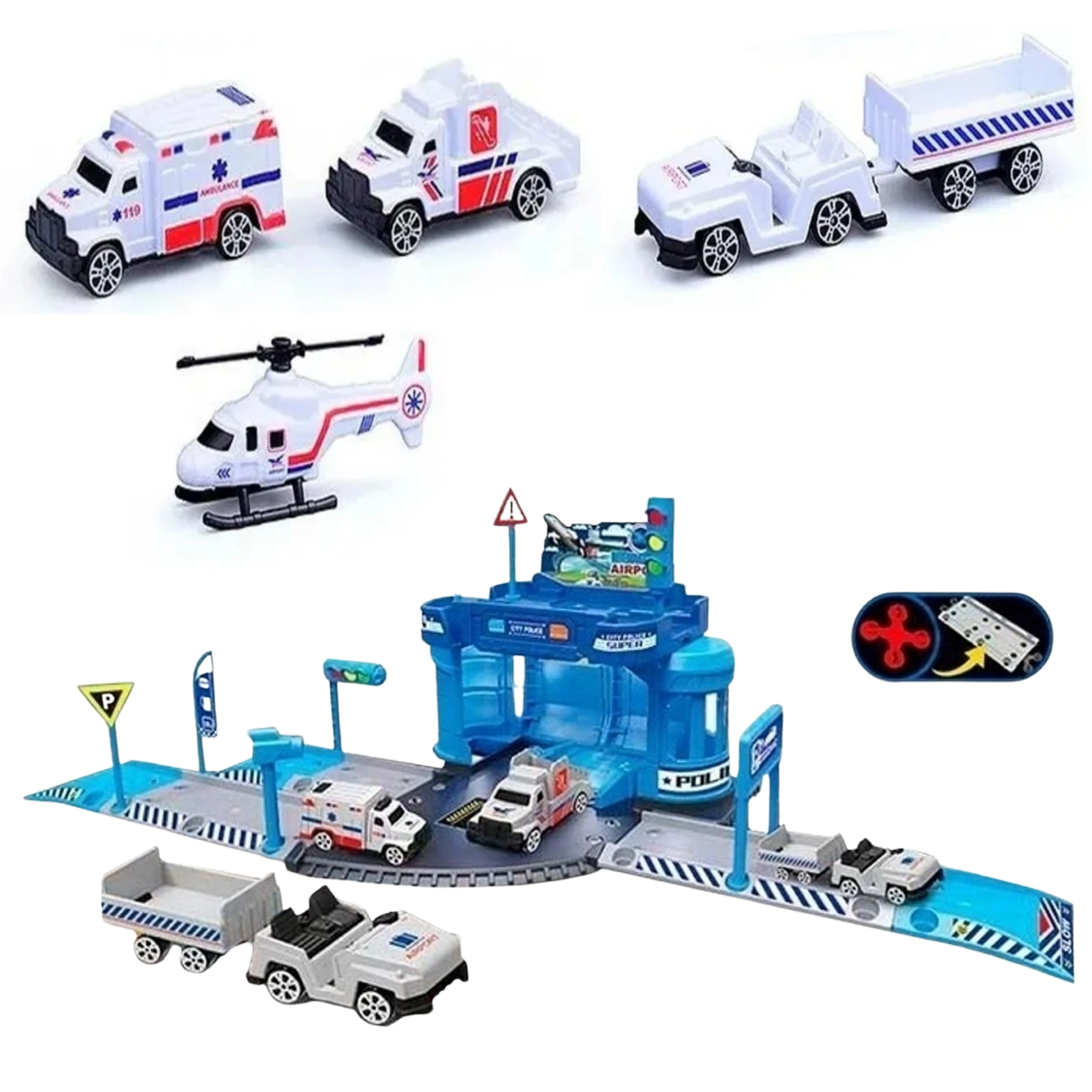 A készlet tartalmaz egy összeállítható állomásépületet, egy rendőrautót, egy kisméretű rendőrségi helikoptert, egy repülőtéri lépcsőjárművet, egy poggyászos utánfutós járművet, közlekedési táblákat, felhajtóút-elemeket és egy 78 × 58 cm-es fólia alátétet. A gyerekek fejlesztik finommotorikájukat, szem–kéz koordinációjukat és fantáziájukat.